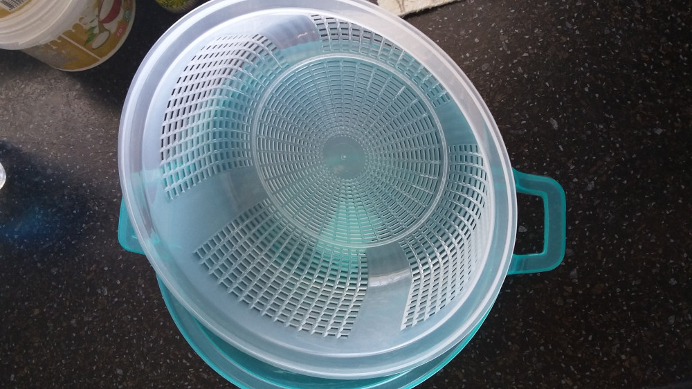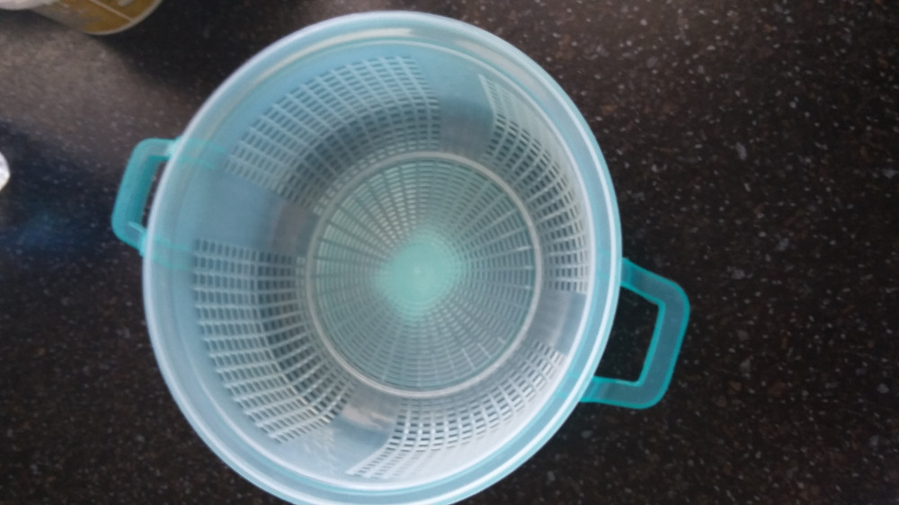Фруктомойка очень понравилась. Дуршлаг внутри оказался белого цвета, а сам поддон бирюзового. Пластик тонкий, но при аккуратном обращении думаю прослужит долго. Мою в нем и фрукты и крупы (горох, гречку), пробовала и рис мыть, но рис чуток проскальзывает сквозь отверстия в дуршлаге. Для меня оказалась очень удобной помощницей на кухне.