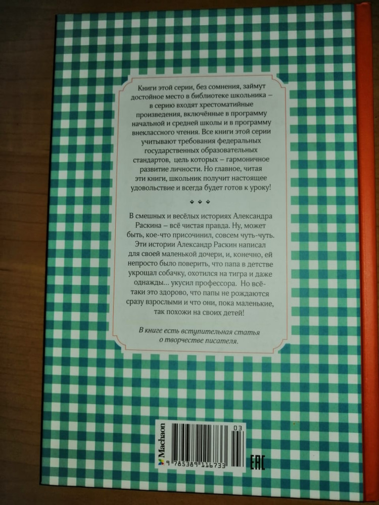 💳 Оплатить за товар можно при получении 🇰🇿 Есть бесплатная доставка по Казахстану от 1 дня 🎁 Копите бонусы с каждой покупки Серия: Чтение — лучшее учение В смешных и весёлых историях Александра Раскина — всё чистая правда. Всё это, конечно, происходило с ним самим, когда он был маленьким. Ну, может быть, кое-что присочинил, совсем чуть-чуть. Его маленькой дочери было непросто поверить, что папа в детстве укрощал собачку, охотился на тигра и даже однажды... укусил профессора. Что он тоже когда-то опаздывал в школу, придумывал всякие небылицы для учителей, обижался на смешные прозвища, которые ему придумывали... Но всё-таки это здорово, что папы не рождаются сразу взрослыми и что они, пока маленькие, так похожи на своих детей! |