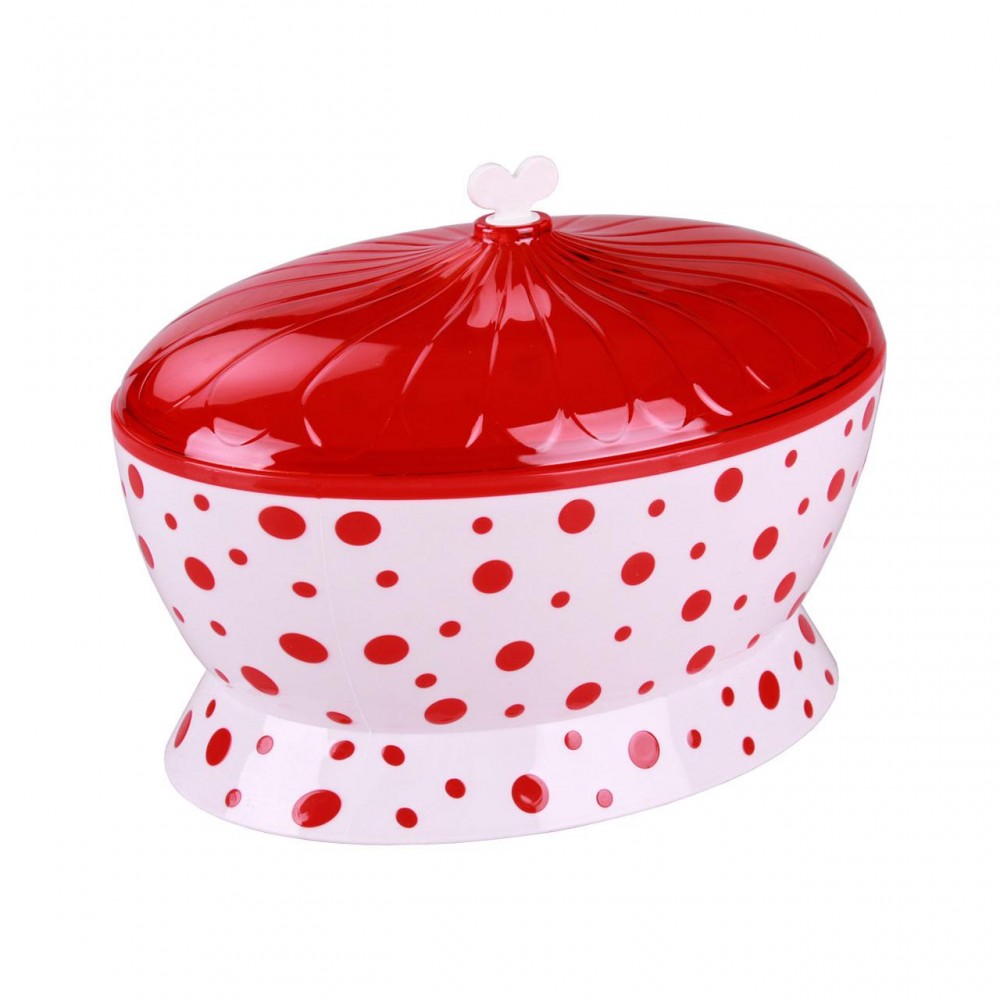 На обеденном столе смотрится празднично, цвет яркий, насыщенный, симпатичная и не большая, и не маленькая. Пригодна для хлеба, печенья, конфет и др. Крышка прозрачная, да еще бантик прикольный! Можно для вентиляции просверлить маленькие дырочки, что мы и сделали. Производителю БРАВО, спасибо за качество!!! В каталоге магазина есть много разных форм этой посуды, при желании можно самим собрать комплект для себя или в подарок.