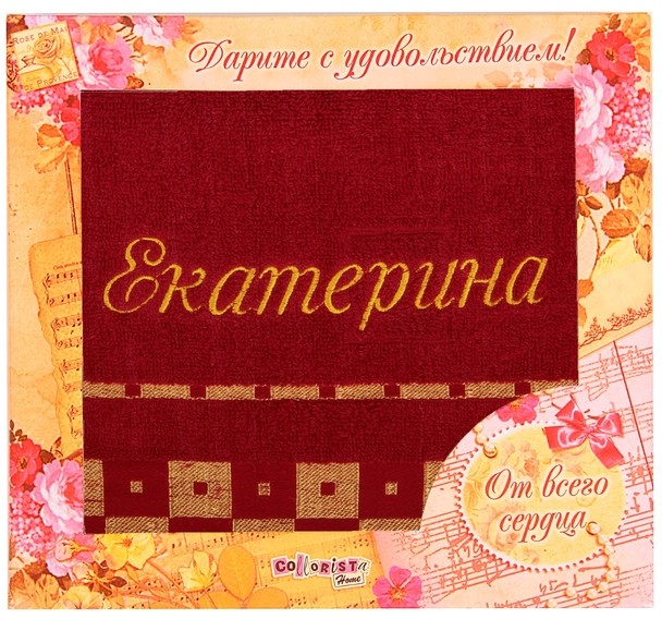 Collorista Полотенце с вышивкой «Екатерина», 47х90 смВ данный момент этот товар отсутствует в продаже. Возможно, у нас найдется аналогичный или похожий товар здесь. В красивой женщине прекрасно все: и душа, и тело, и, конечно же, имя! Давно известно, что имя — самый важный и приятный звук для человека на любом языке. Поэтому это замечательное полотенце «Екатерина» займет достойное место в вашей ванной комнате и будет каждый день радовать свою обладательницу. |