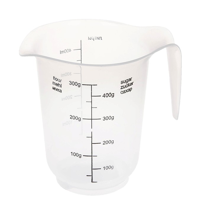Удобный, маленький кувшин, подходит как для жидкостей, так и для сыпучих продуктов (мука, сахар)