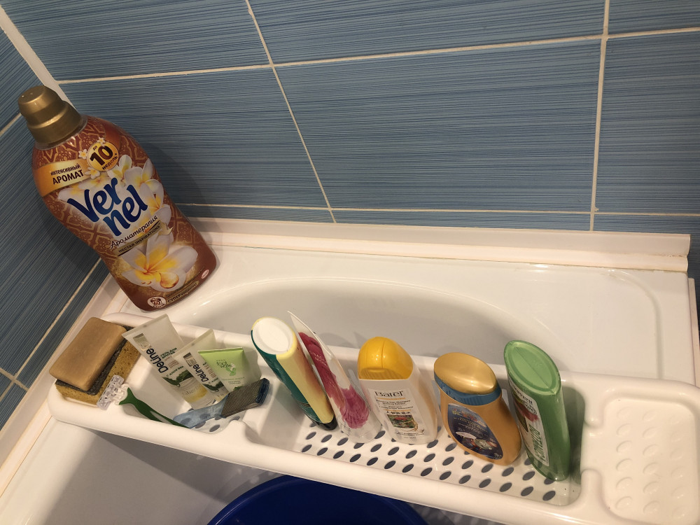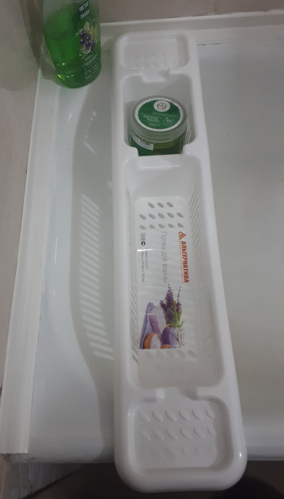 Хорошая полочка. Качественный пластик. Единственно, нужно иметь ванну квадратную и борта у ванны широкие, поэтому пришлось поставить ее сверху на ванну около смесителя, может не так красиво, но все равно удобно.
