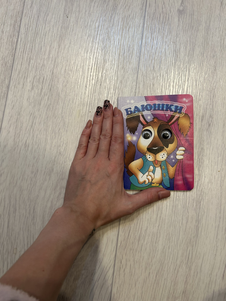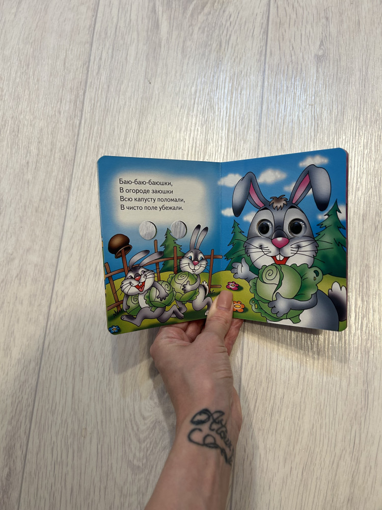 Книжка очень хорошая: удобный формат, страницы из плотного картона. Ребенку (6 месяцев) очень нравится рассматривать картинки, трогать глазки ,ну и "пробовать на зубок"