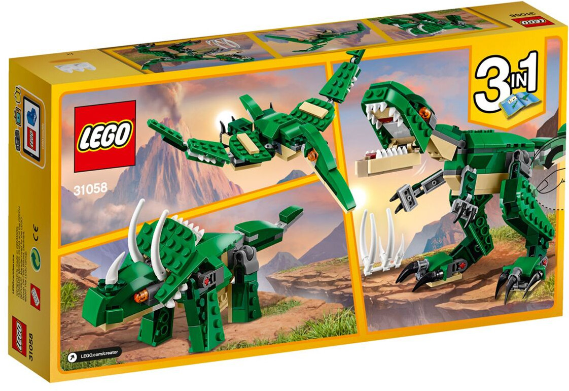 LEGO (ЛЕГО) Конструктор Creator 31058 Грозный динозавр. Mighty DinosaursВ данный момент этот товар отсутствует в продаже. Возможно, у нас найдется аналогичный или похожий товар здесь. Серия: LEGO Creator От шагов грозного Тирекса содрогается земля! У этого ящера, раскрашенного в тёмно-зелёный и бежевый цвета, ярко-оранжевые глаза. Открой его рот и продемонстрируй всем острые как бритва клыки. Ещё Тирекс может двигать головой, хвостом и лапами с огромными когтями. В набор также входят кости последней жертвы Тирекса. Замени модули и собери других Злых динозавров: сильного Трицератопса или устрашающего Птеродактиля. |