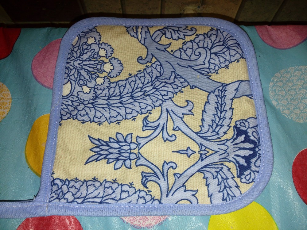 Замечательная прихватка. Мне понравилось, что рулик, которым оформлены края прихватки, тоже из хлопчатобумажной ткани. Они не будут оплавляться.