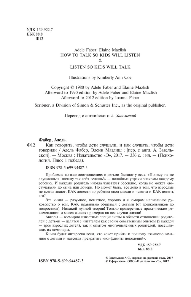 Как говорить, чтобы дети слушали, и как слушать, чтобы дети говорилиВ данный момент этот товар отсутствует в продаже. Возможно, у нас найдется аналогичный или похожий товар здесь. Серия: Психология. Плюс 1 победа (новое оформление, обложка) Проблемы во взаимоотношениях с детьми бывают у всех. «Почему ты не слушаешься, почему так себя ведешь?» — подобные упреки знакомы каждому ребенку. И каждый родитель иногда чувствует бессилие, когда не может «достучаться» до сына или дочери. Но может быть, все дело в том, что взрослые не всегда знают, КАК донести до ребенка свои мысли и чувства, и КАК понять его? Эта книга — разумное, понятное, хорошо и с юмором написанное руководство о том, КАК правильно общаться с детьми (от дошкольников до подростков). Никакой нудной теории! Только проверенные практические рекомендации и масса живых примеров на все случаи жизни! Авторы — всемирно известные специалисты в области отношений родителей с детьми — делятся с читателем как своим собственным опытом (у каждой — трое взрослых детей), так и опытом многочисленных родителей, посещавших их семинары. Книга будет интересна всем, кто хочет прийти к полному взаимопониманию с детьми и навсегда прекратить «конфликты поколений». |