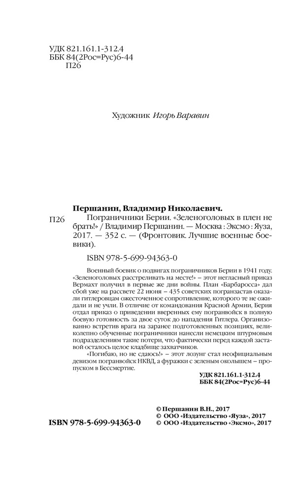 Пограничники Берии. «Зеленоголовых в плен не брать!»В данный момент этот товар отсутствует в продаже. Возможно, у нас найдется аналогичный или похожий товар здесь. Серия: Фронтовик. Лучшие военные боевики Военный боевик о подвигах пограничников Берии в 1941 году. «Зеленоголовых расстреливать на месте!» — этот негласный приказ Вермахт получил в первые же дни войны. План «Барбаросса» дал сбой уже на рассвете 22 июня — 435 советских погранзастав оказали гитлеровцам ожесточенное сопротивление, которого те не ожидали и не учли. В отличие от командования Красной Армии, Берия отдал приказ о приведении вверенных ему погранвойск в полную боевую готовность за двое суток до нападения Гитлера. Организованно встретив врага на заранее подготовленных позициях, великолепно обученные пограничники нанесли немецким штурмовым подразделениям такие потери, что фактически перед каждой заставой осталось целое кладбище захватчиков. «Погибаю, но не сдаюсь!» — этот лозунг стал неофициальным девизом погранвойск НКВД, а фуражки с зеленым околышем — пропуском в Бессмертие. |