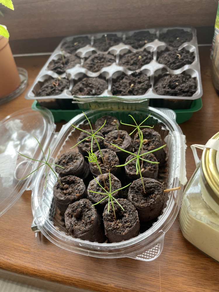 Для меня, пытавшейся когда-то вырастить хвойники из семечек, стало удивительным, что буквально на первой неделе показались росточки. Сначала они были коричневыми, сейчас становятся зелёными. Сеяла без стратификации, просто так, слегка присыпав грунтом. В один лоток посеяла и сосну, и ель. Сосна растет быстрее