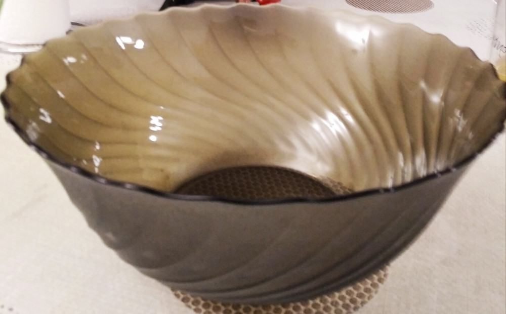 Классный салатник из коричневой серии. Волнистые края, внутри гладкий, снаружи шероховатый ребристый. Порция салата приличная помещается, абсолютно довольна им!