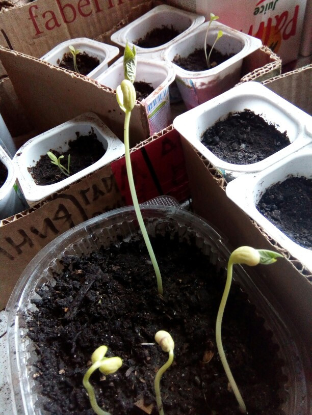 Взошла вся фасоль. Вот только хотелось именно такую жёлтую. Два куста были с жёлтой фасолью. Остальные все зелёные, так и не поняла спаржевые или нет.