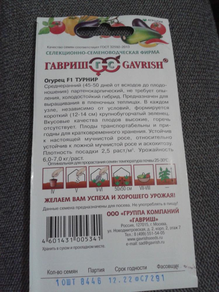 Гавриш Семена. Огурец «Турнир F1», 10 шт+3 соответствие описанию годность урожайность вкус