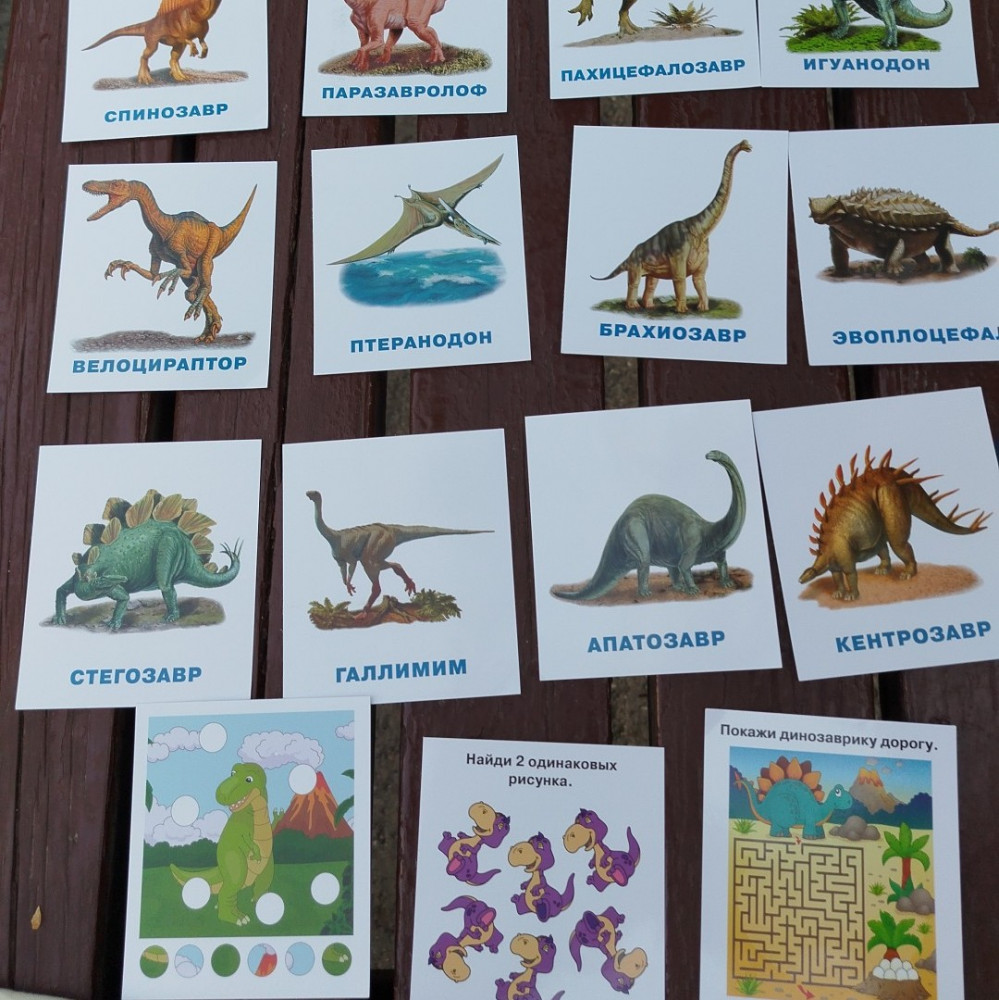 Хорошие карточки. Достаточно прочный картон, яркие, кроме самих названий динозавров и текста о них, есть несколько карточек с простыми заданиями для детей, типа лабиринт, найди 2 одинаковые картинки, что лишнее и тд.