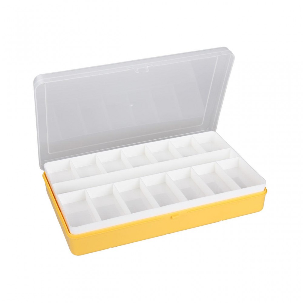 Отличный контейнер, много мелочей вмещает. Не пахнет, закрывается плотно. К тому же он двойной: верхняя белая часть вынимается, желтая тоже довольна емкая.