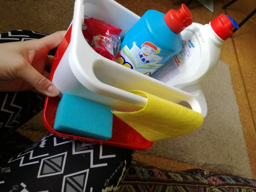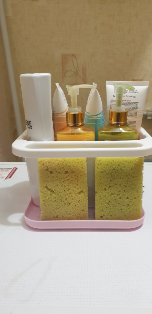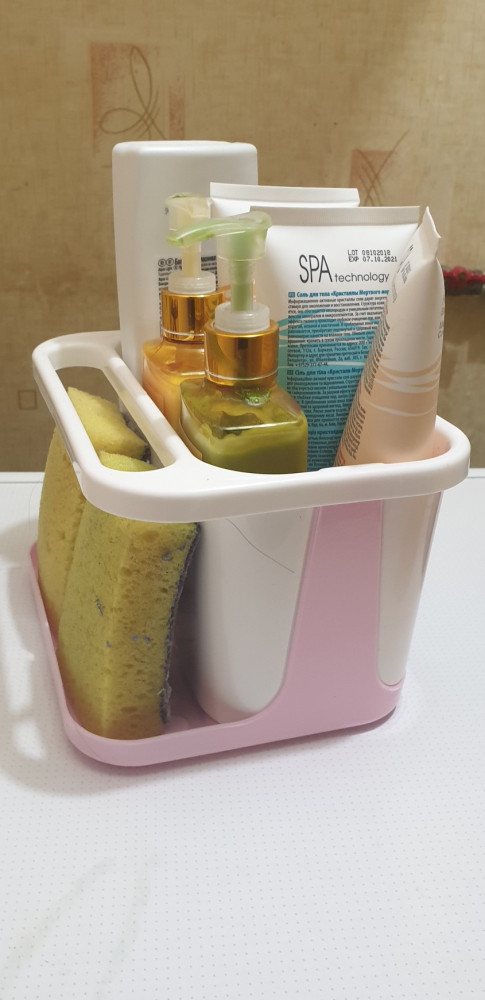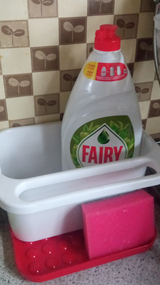 Удобная и практичная вещь. Помещаются три флакона, таблетки для посудомоечной машины и губки.
