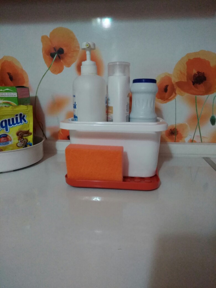 Отличная и полезная вещь на кухне для создания порядка! Всегда думала, куда деть эту тряпку ))) Теперь, она висит на своем месте, и по сути, ее даже не видно. Габариты конечно, меня приятно удивили, я думала эта подставка намного меньше. На самом деле туда реально помещается 3 банки с чистящими, и моющими средствами. Качество пластика хорошее, без запаха. Советую!!!