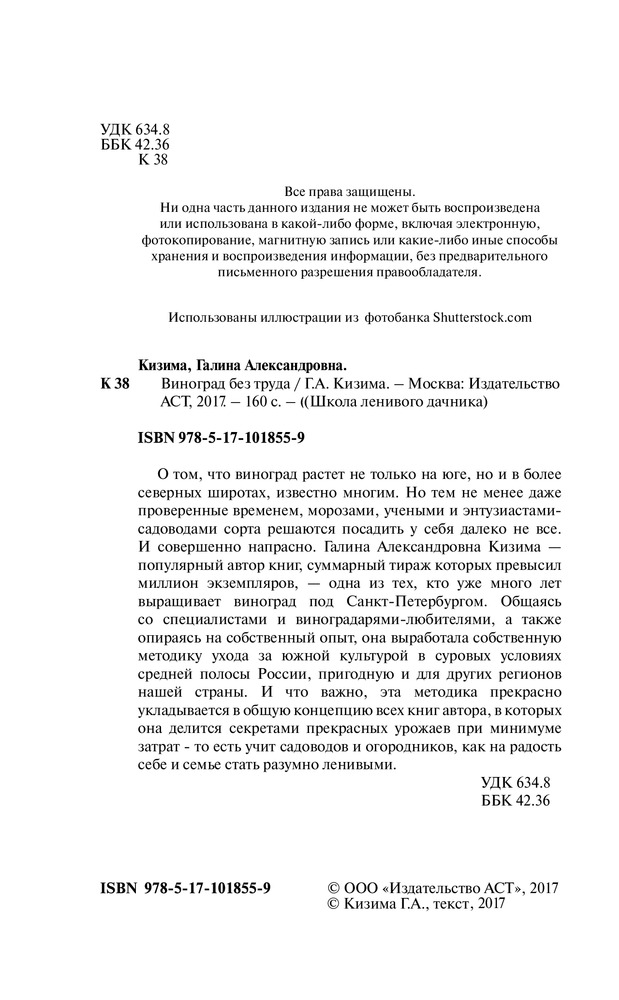 Виноград без трудаВ данный момент этот товар отсутствует в продаже. Возможно, у нас найдется аналогичный или похожий товар здесь. Серия: Школа ленивого дачника О том, что виноград растет не только на юге, но и в более северных широтах, известно многим. Но тем не менее даже проверенные временем, морозами, учеными и энтузиастами-садоводами сорта решаются посадить у себя далеко не все. И совершенно напрасно. Галина Александровна Кизима — популярный автор книг, суммарный тираж которых превысил миллион экземпляров, — одна из тех, кто уже много лет выращивает виноград под Санкт-Петербургом. Общаясь со специалистами и виноградарями-любителями, а также опираясь на собственный опыт, она выработала собственную методику ухода за южной культурой в суровых условиях средней полосы России, пригодную и для других регионов нашей страны. И что важно, эта методика прекрасно укладывается в общую концепцию всех книг автора, в которых она делится секретами прекрасных урожаев при минимуме затрат — то есть учит садоводов и огородников, как на радость себе и семье стать разумно ленивыми. |