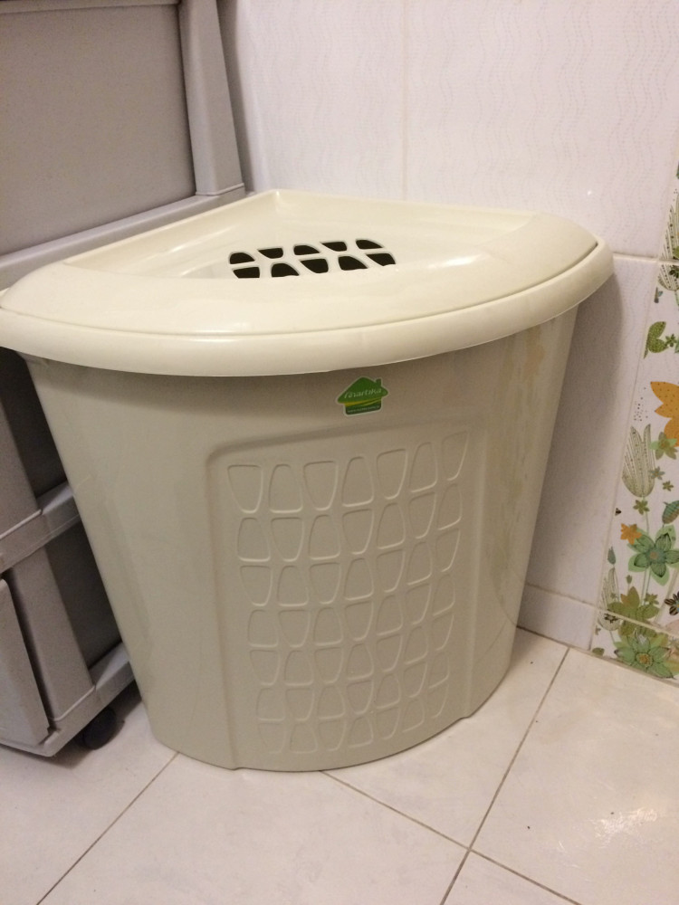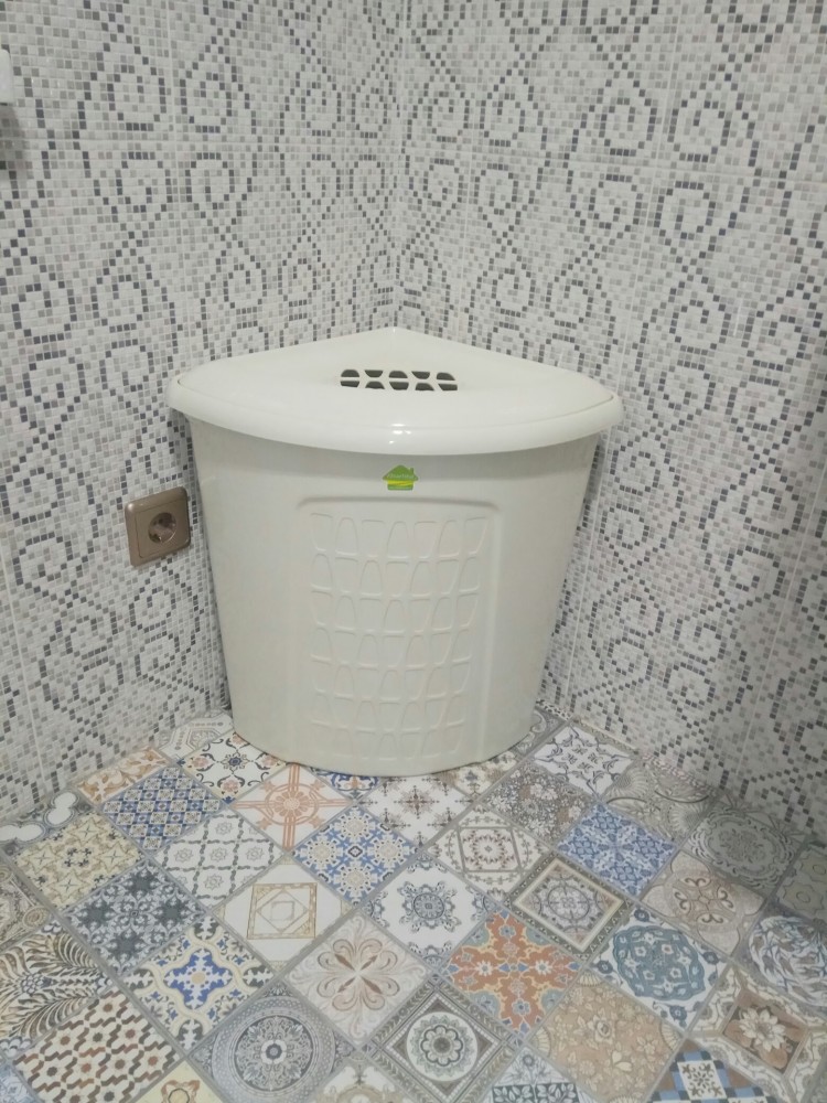 Хорошая корзина, только не угадала с цветом. Слоновая кость слишком темная и с сероватым оттенком. Цвет напоминает цвет пластикового изделия после длительного хранения, удешевляет вещь на самом деле. Белая бы лучше смотрелась, это на мой вкус. Предусмотрены вентиляционные отверстия по бокам корзины. Даже если не в углу размещать, размещается компактно и интересно в любой части ванной.