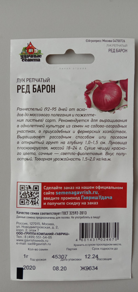 Гавриш Семена. Лук репчатый «Ред Барон», 0,5 г-25% +8 сочный не острый взошли мало семян