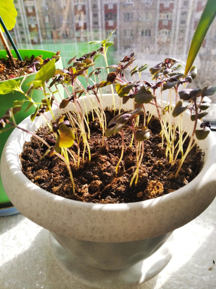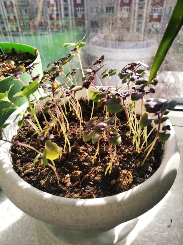 Брала для выращивания на подоконнике в квартире. Взошли дружно хорошо. Посадила в середине марта в горшочек на подоконнике и накрыла прозрачным пакетом - всходы появились через несколько дней. Спустя месяц - большинство ростков с фиолетовым оттенком, но есть пара зеленый.