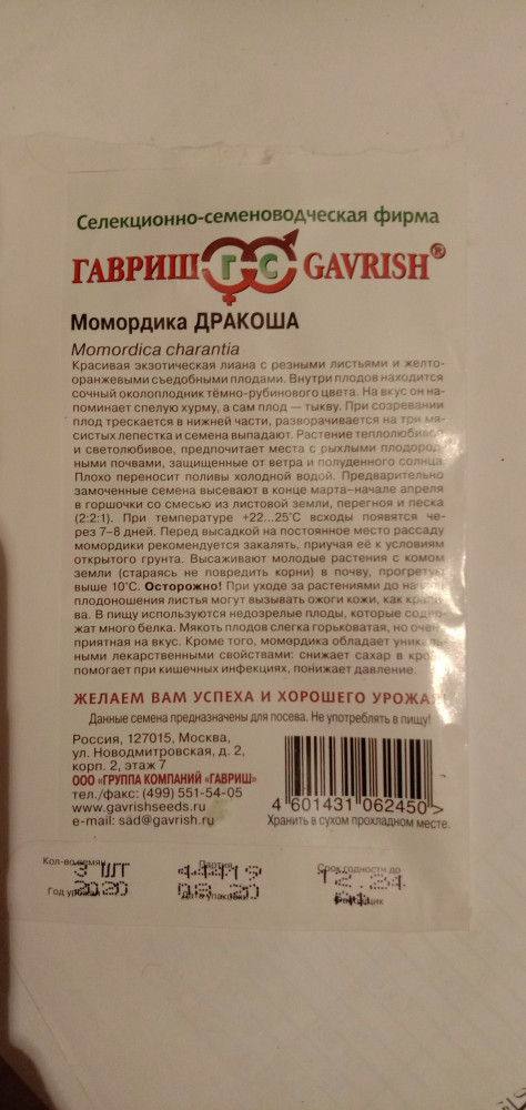 Гавриш Семена. Момордика «Дракоша» (индийский гранат), 3 шт.-25% +13 низкая всхожесть нестабильная всхожесть