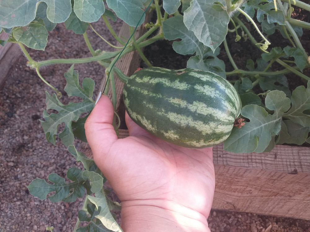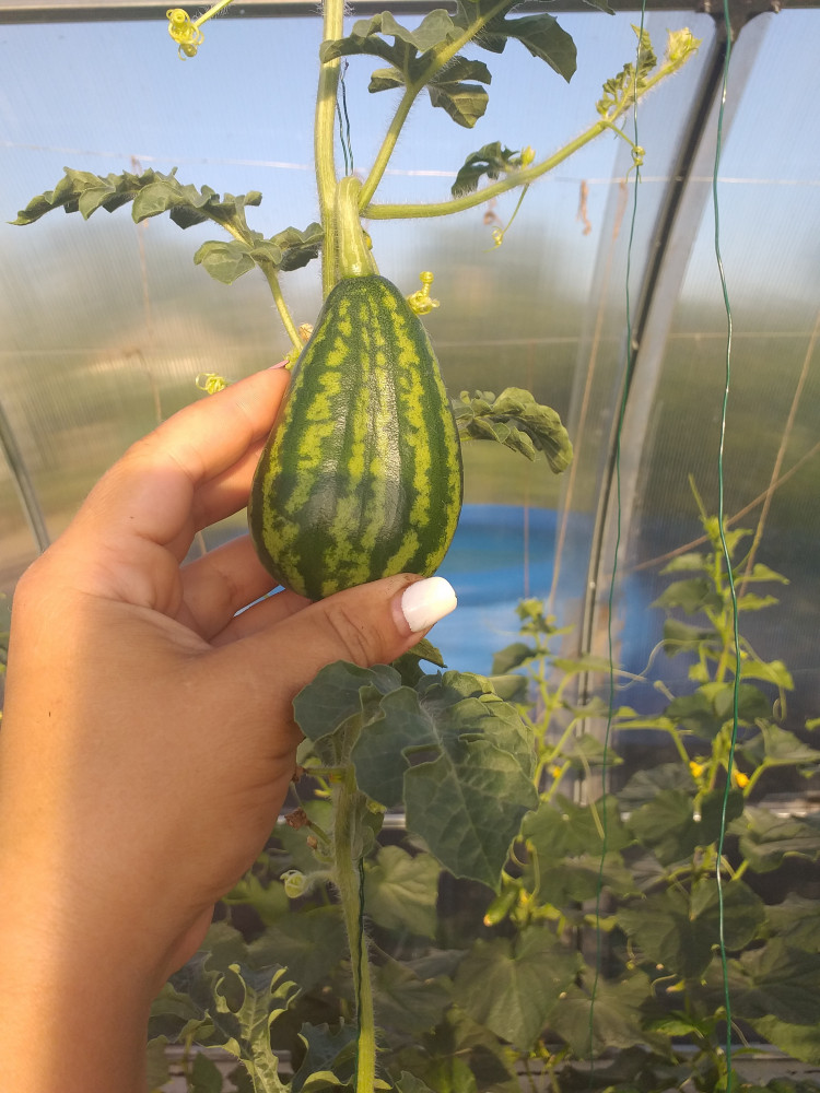 Фото на начало июля, садились в теплицу сразу семенами, плодики если не опылять отмирают, думаю, если бы сразу догадались, арбузики были бы гораздо крупнее, завязи много