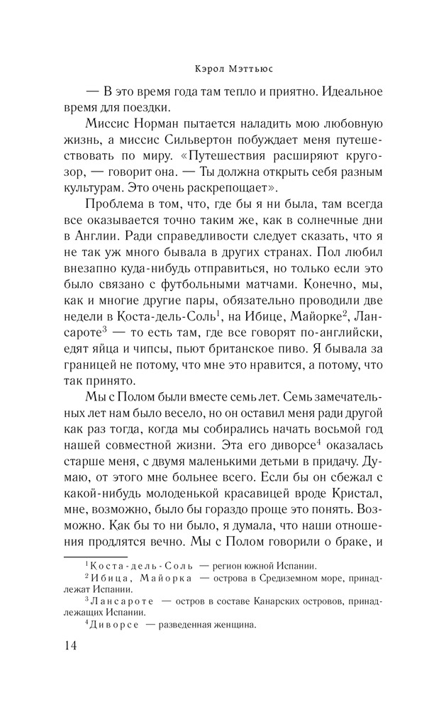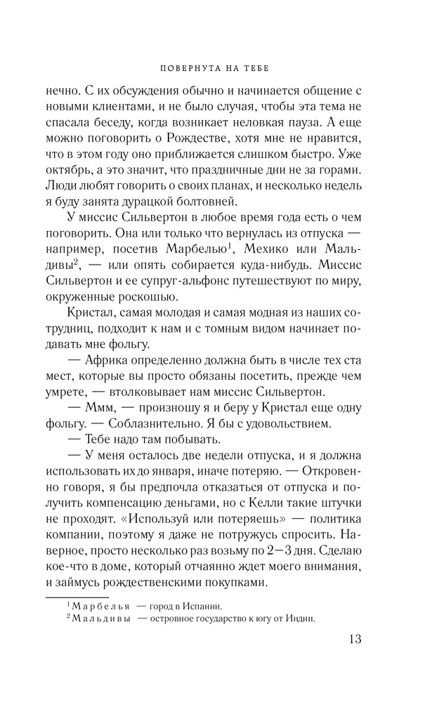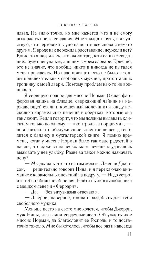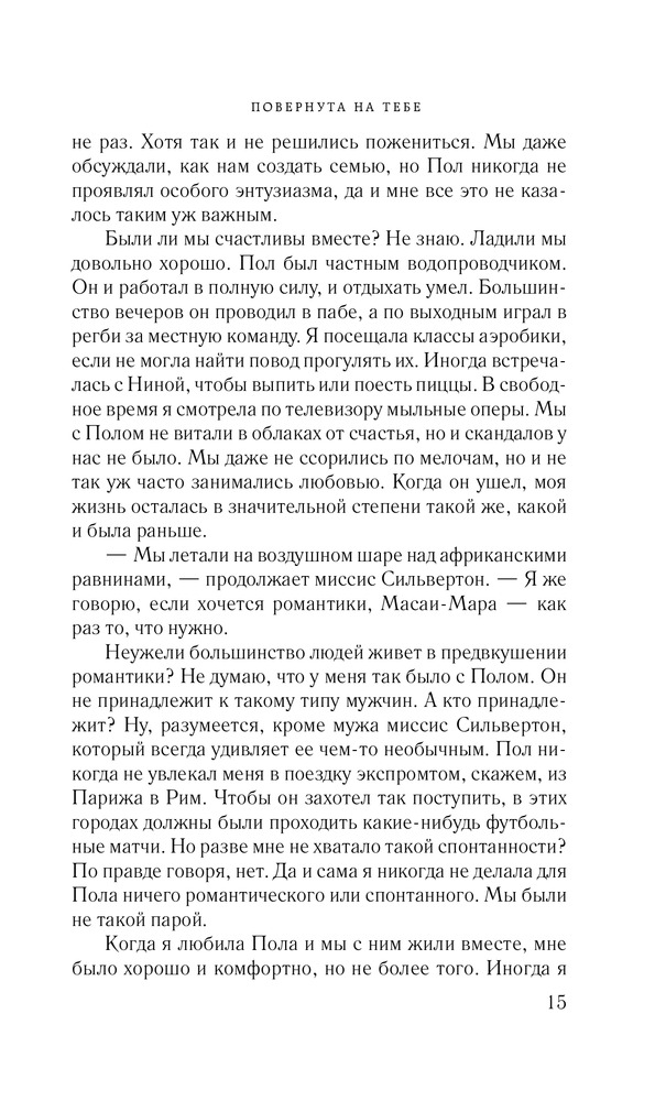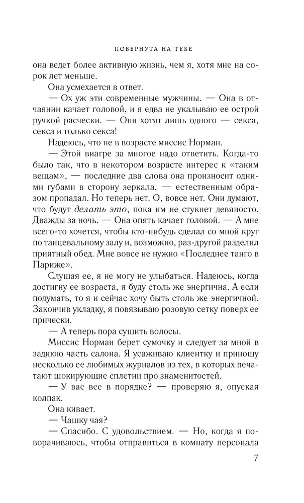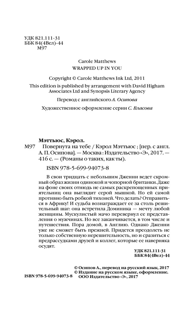 Повернута на тебеВ данный момент этот товар отсутствует в продаже. Возможно, у нас найдется аналогичный или похожий товар здесь. Серия: Романы о таких, как ты В свои тридцать с небольшим Дженни ведет скромный образ жизни одинокой и чопорной британки. Даже на фоне своих отнюдь не самых раскрепощенных приятельниц она выглядит серой мышкой. Но ей самой противно быть робкой тихоней. Что делать? Отправиться в Африку! И судьба вознаграждает ее за столь решительный шаг: она встретила Доминика — мечту любой женщины. Мускулистый мачо перевернул ее представления о мужчинах. Но все заканчивается, в том числе и путешествия. Пора домой, в Англию. Однако Дженни уже не сможет быть прежней. Придется преодолеть не только собственную нерешительность, но и сразиться с предрассудками друзей и коллег, которые ее наверняка осудят. |