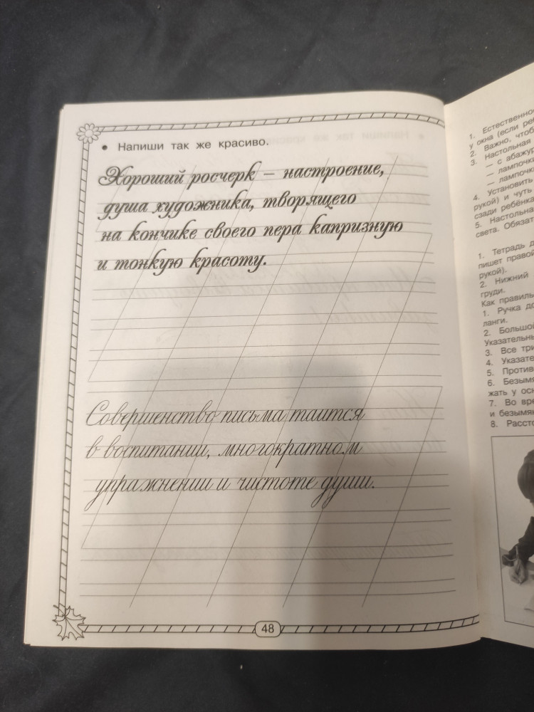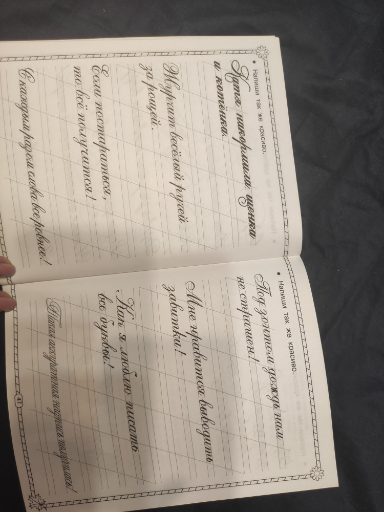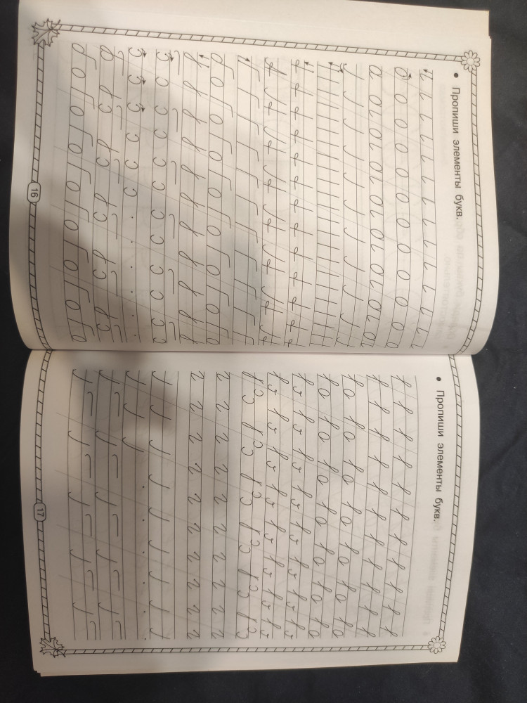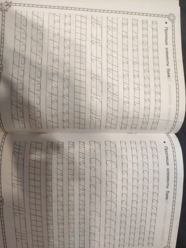 вообще не поняла восторгов. ни о чем тетрадка. там просто напечатанные буквы и крючки целиком. то есть где идёт подготовка к прописным буквам нет перехода "как должно выглядеть-обведи точки-напиши сам" там нет ни возможности обвести точки ни написать самому, тупо напечатано всё на полтетради. а потом ребенок должен сразу сам писать буквы, на это есть две страницы и потом сразу пусть слова пишет🤦 причем такой шрифт в школах недопустим. обратите внимание на нумерацию страниц у меня на фото. вот такие резкие переходы от печатных букв к художественной каллиграфии! какая задача стоит перед авторами этого "шедевра обучения"? научить ребенка к первому классу или довести до слез и отбить желание писать в целом?! составляли чекнутые. есть возможность обводить только на печатных буквах, которые вообще здесь зачем непонятно тоже. в общем и целом не о чем тетрадка. не рекомендую.