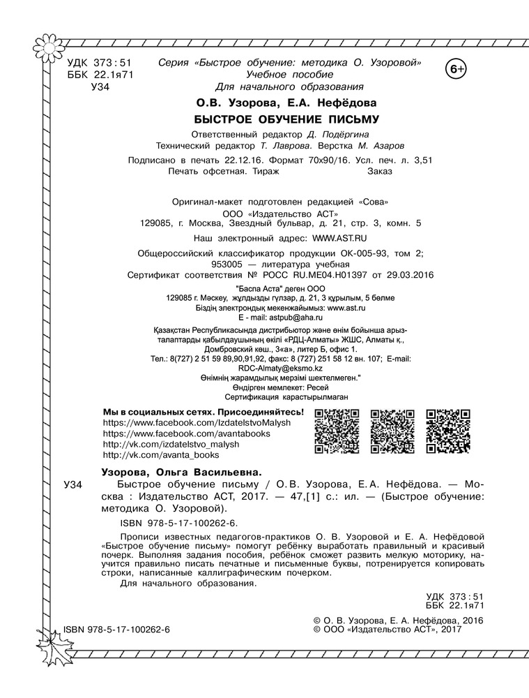 Быстрое обучение письмуОльга Васильевна Узорова, Елена Алексеевна Нефедова В данный момент этот товар отсутствует в продаже. Возможно, у нас найдется аналогичный или похожий товар здесь. Серия: Быстрое обучение: методика О.В. Узоровой Прописи известных педагогов-практиков О.В. Узоровой и Е.А. Нефёдовой «Быстрое обучение письму» помогут ребёнку выработать правильный и красивый почерк. |