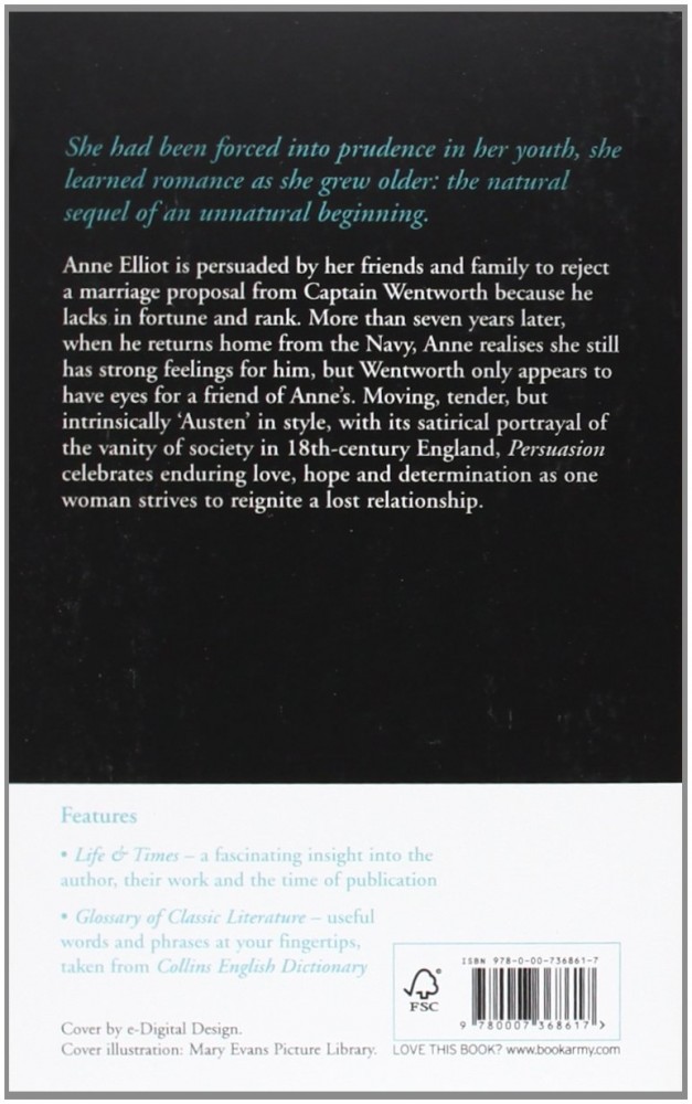 💳 Оплатить за товар можно при получении 🇰🇿 Есть бесплатная доставка по Казахстану от 1 дня 🎁 Копите бонусы с каждой покупки Серия: Collins Classics HarperCollins is proud to present its new range of best-loved, essential classics. ’She had been forced into prudence in her youth, she learned romance as she grew older: the natural sequel of an unnatural beginning.’ Written at the end of the Napoleonic Wars, Persuasion is a tale of love, heartache and the determination of one woman as she strives to reignite a lost love. Anne Elliot is persuaded by her friends and family to reject a marriage proposal from Captain Wentworth because he lacks in fortune and rank. More than seven years later, when he returns home from the Navy, Anne realises she still has strong feelings for him, but Wentworth only appears to have eyes for a friend of Anne’s. Moving, tender, but intrinsically ’Austen’ in style, with it’s satirical portrayal of the vanity of society in eighteenth-century England, Persuasion celebrates enduring love and hope. |