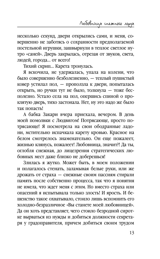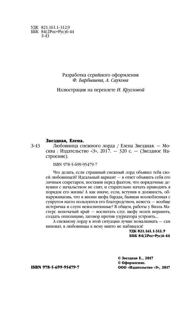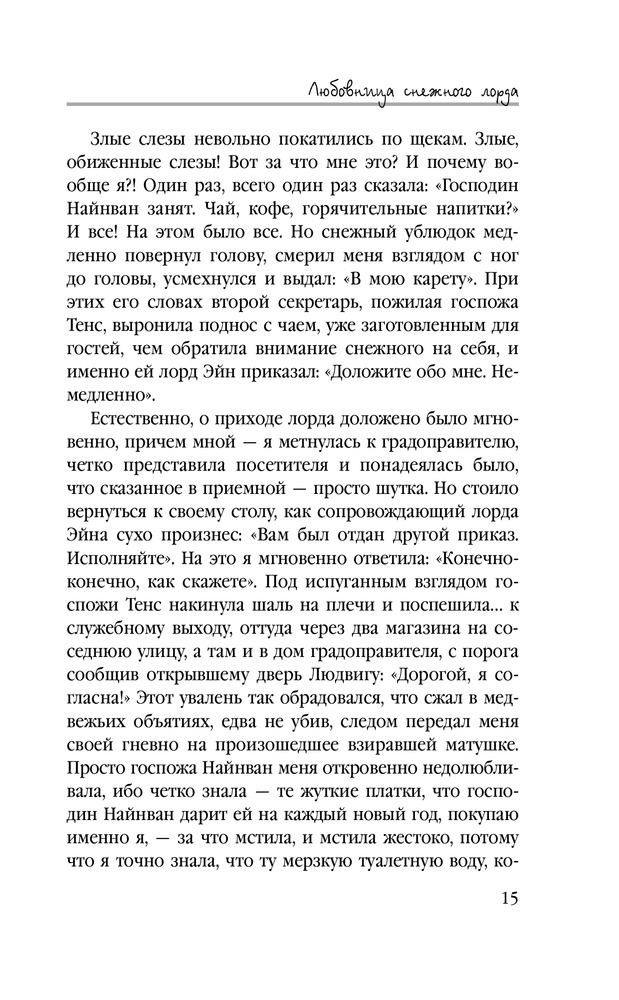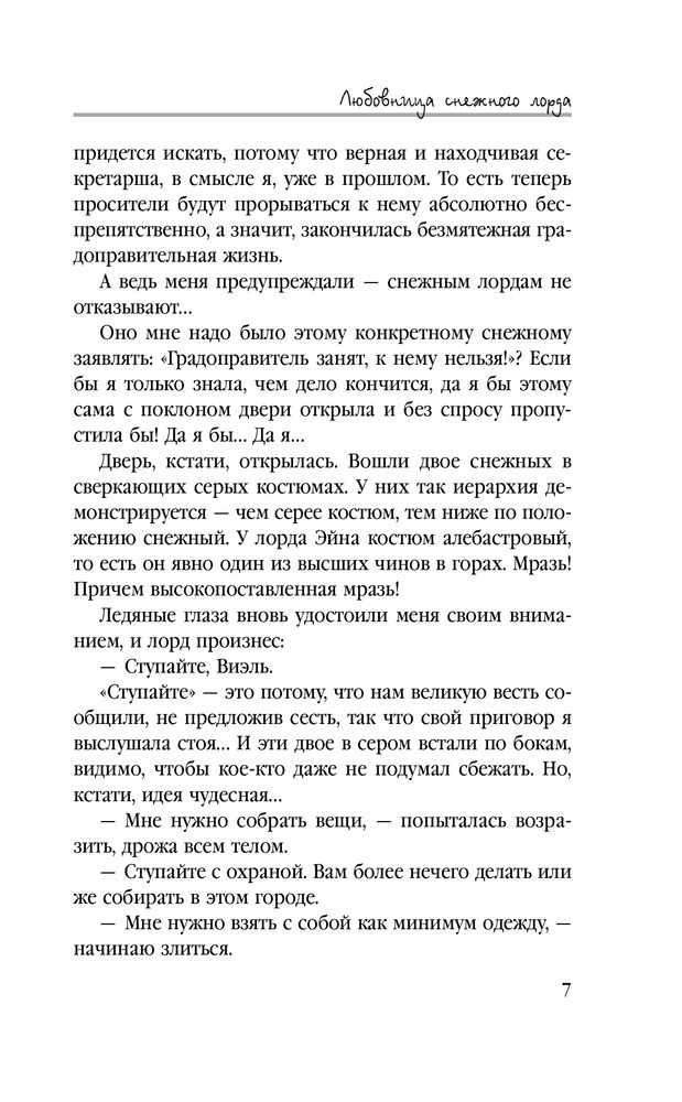 Любовница снежного лордаВ данный момент этот товар отсутствует в продаже. Возможно, у нас найдется аналогичный или похожий товар здесь. Серия: Звездное Настроение Что делать, если страшный снежный лорд объявил тебя своей любовницей? Идеальный вариант — в ответ объявить себя его личным секретарем, поставив перед фактом, что порядочные девушки с начальством не спят, и старательно начать приводить в порядок его жизнь! А как иначе, если, вступив в должность, обнаруживаешь, что в жизни шефа бардак, бывшая возлюбленная с супругом нагло пользуются его благородством, невеста — вообще истеричка и слуги невоспитанные? В общем, работы у Виэль Мастерс непочатый край — воспитать слуг, шефу мозги вправить, создать оппозицию, заговор против узурпатора устроить… |