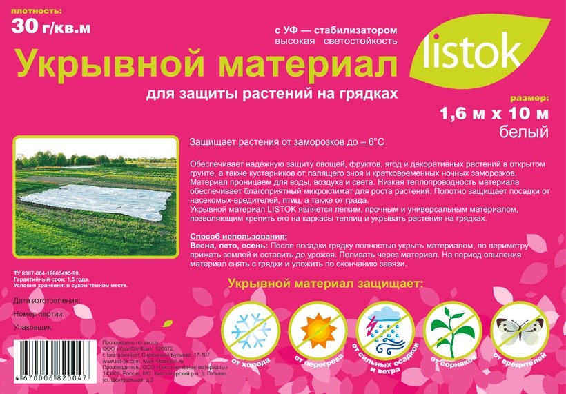 Listok Укрывной материал LISTOK 30, 1,6 х 10 мВ данный момент этот товар отсутствует в продаже. Возможно, у нас найдется аналогичный или похожий товар здесь. Предназначен для защиты растений на грядках, деревьев и кустарников. |