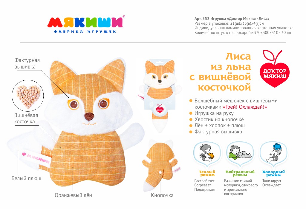 Мякиши Доктор мякиш «Лиса»В данный момент этот товар отсутствует в продаже. Возможно, у нас найдется аналогичный или похожий товар здесь. Доктор Мякиш-Лиса — это уникальная льняная игрушка на руку с сюрпризом! Внутри Лисы мешочек с настоящими вишнёвыми косточками, который можно вынимать, нагревать в микроволновой печи и остужать в холодильнике. Благодаря чудесным свойствам вишнёвых косточек, игрушку можно использовать в трёх температурных режимах: тёплом, холодном и нейтральном. Яркий образ Лисы, плюшевый хвостик на кнопке, плюшевые ушки и мордочка, льняное тельце, тепло и приятный звук вишнёвых косточек, способствуют эмоциональному и сенсорному развитию малыша. Вынув мешочек с косточками, Лису можно использовать в качестве игрушки на руку, придумывать и инсценировать разные интересные истории про Лису и её лесных друзей. Такая импровизация непременно будет иметь успех у Вашего малыша. |