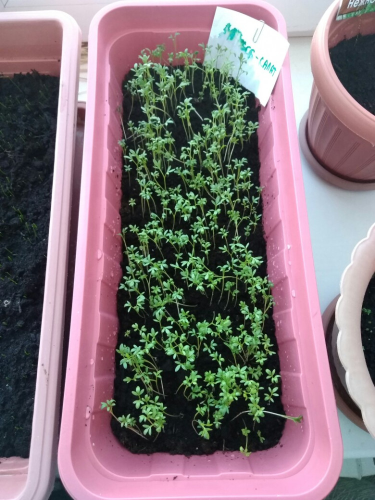 Взошли на 3 день, так как семян не очень много в пакетике, посеяла вместе с кресс- салатом" забава". Посмотрю, что получится. Но урожай пока не срезала, т к ростки ещё маленькие.