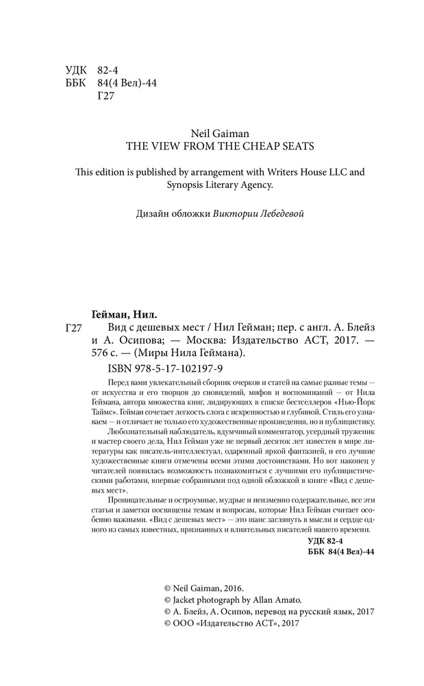 Проницательные и остроумные, мудрые и неизменно содержательные, все эти статьи и заметки посвящены темам и вопросам, которые Нил Гейман считает особенно важными. «Вид с дешевых мест» — это возможность заглянуть в мысли и сердце одного из самых известных, признанных и влиятельных писателей нашего времени.