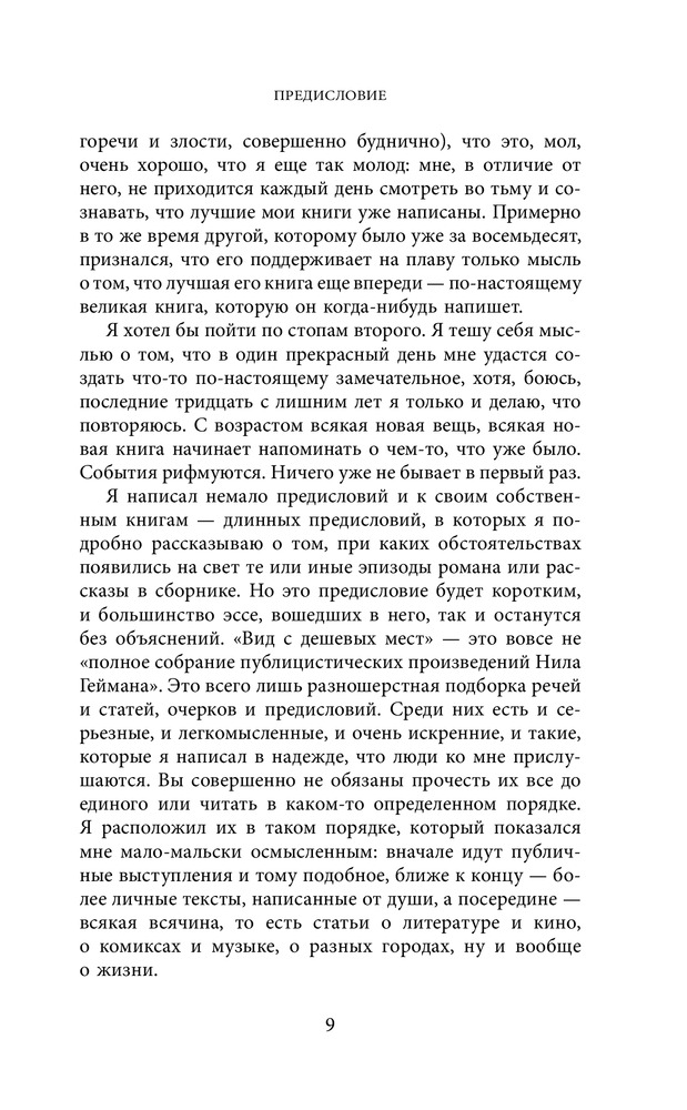 Любознательный наблюдатель, вдумчивый комментатор, усердный труженик и мастер своего дела, Нил Гейман уже не первый десяток лет известен в мире литературы как писатель-интеллектуал, одаренный яркой фантазией, и его лучшие художественные книги отмечены всеми этими достоинствами. Но вот, наконец, у читателей появилась возможность познакомиться с лучшими его публицистическими работами, впервые собранными под одной обложкой в книге «Вид с дешевых мест». Перед вами более шестидесяти очерков, предисловий и речей Нила Геймана — серьезных и в то же время шутливых, выдающих богатую эрудицию, написанных доступно и просто. Спектр интересов и проблем, затронутых в этом сборнике, необыкновенно широк: среди прочего, Гейман рассказывает о своих современниках и предшественниках в области литературы, о музыке, об искусстве сочинителя книг, о комиксах и книжных магазинах, о путешествиях и волшебных сказках, об Америке, о вдохновении, библиотеках и призраках, а в очерке, давшем название всему сборнику, трогательно и подчас самокритично делится своими воспоминаниями о церемонии вручения «Оскара» в 2010 году.