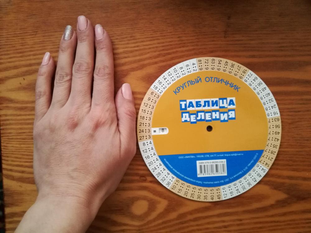 Сделана из плотного картона, прокручивается по кругу хорошо, цифры четкие, цвета яркие. Размер чуть меньше ладони (на фото видно), удобна в применении и тем, что двусторонняя: деление и умножение. Детям, как подсказка в школе и дома при выполнении д/з. Заказывала сыну - второкласснику, когда они проходили в школе умножение и деление. Раньше не стала, пока темы не проходили, смысла нет, так как подходит именно для подсказки.