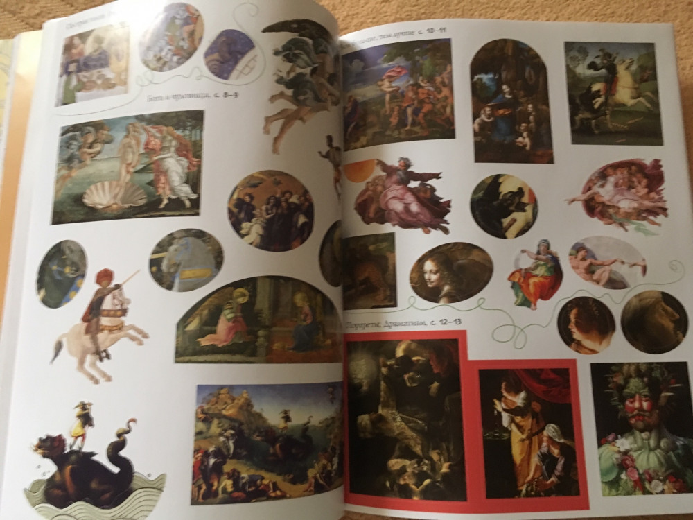 Достаточно своеобразная книга. Большой непонятный формат. Картонная обложка. Внутри страниц 30 сама книга и потом еще столько же страниц с наклейками. Мелкие репродукции, явно не для малышей. Да, наклейки интересны детям, это и привлекает в книге. Но первое впечатление... блёклые страницы. И только после наклеек они оживают. А если ребенок маленький, то будут еще и пестрить)) для 0+ я бы не советовала.