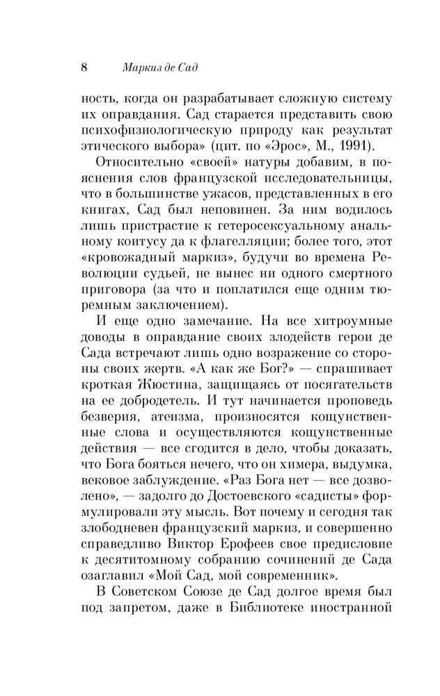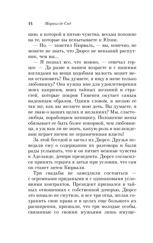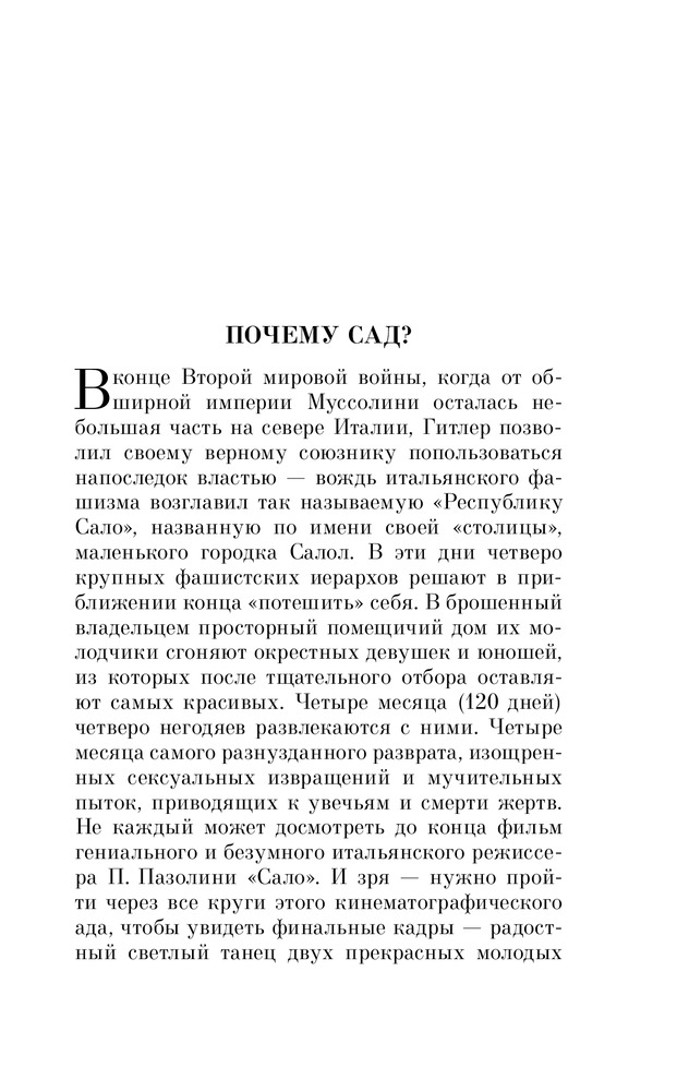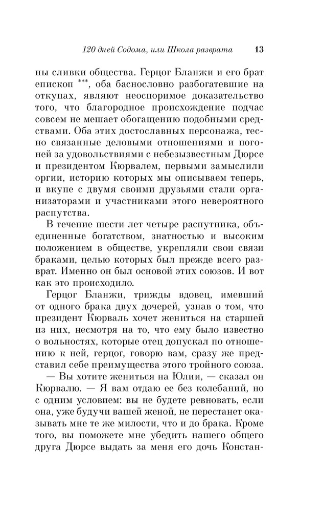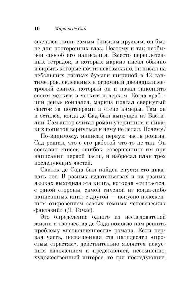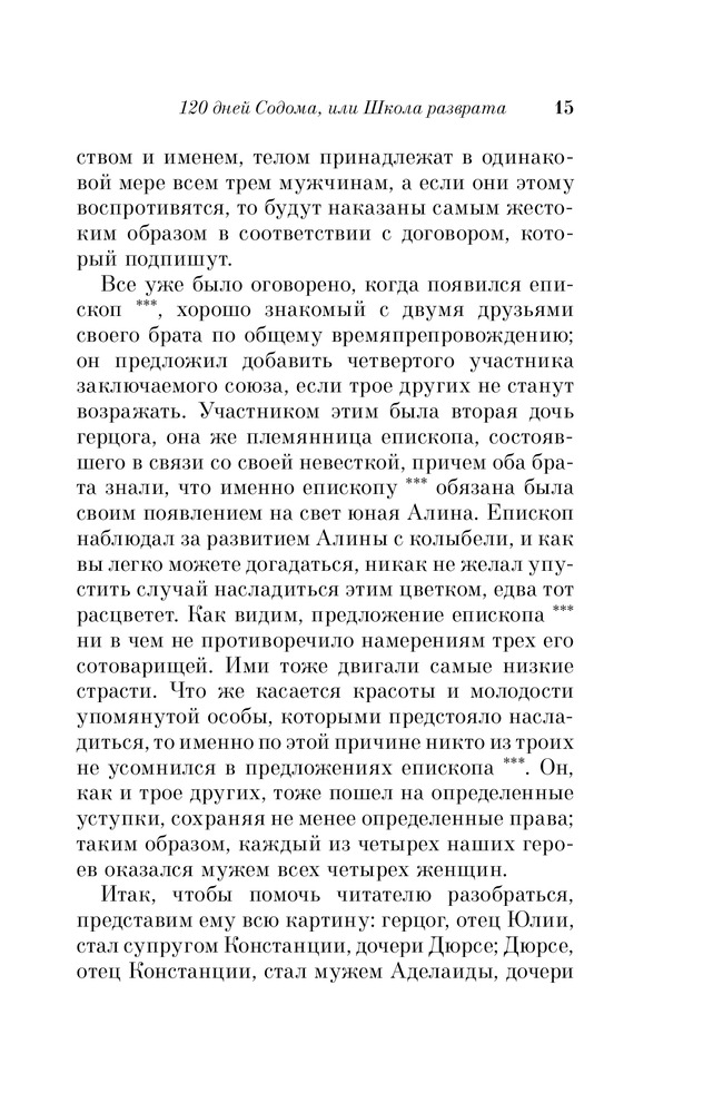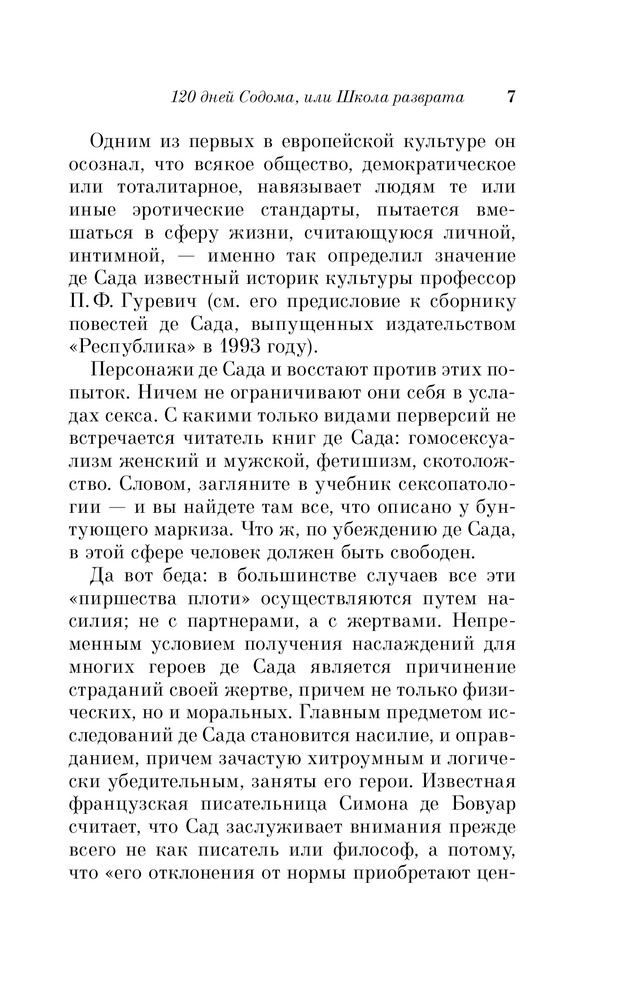 Именно это классическое произведение, как мне, кажется написано не совсем нормальным человеком. Но ведь остальные произведения этого маркиза, кстати и непристойные или исторические - легко читать и не вызывают такого отторжения. Ну а этот роман не для меня - не стала дочитывать. Может быть эта книга для тех, кто хочет понять глубины человеческого падения: про героев можно сказать - это физиология без духа или человек как животное, но все-таки не животное, у животных нет похоти, обжорства и жестокости, ну а человек с больной фантазией - это автор.