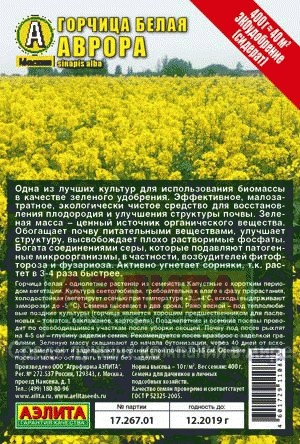 Аэлита Семена. Горчица белая «Аврора», 400 гВ данный момент этот товар отсутствует в продаже. Возможно, у нас найдется аналогичный или похожий товар здесь. Одна из лучших культур для использования биомассы в качестве зеленого удобрения. Эффективное, малозатратное, экологически чистое средство для восстановления плодородия и улучшения структуры почвы. Зеленая масса – ценный источник органического вещества. Обогащает почву питательными веществами, улучшает структуру, высвобождает плохо растворимые фосфаты. Богата соединениями серы, которые подавляют патогенные микроорганизмы, в частности, возбудителей фитофтороза и фузариоза. Активно угнетает сорняки, т.к. растет в 3-4 раза быстрее. |