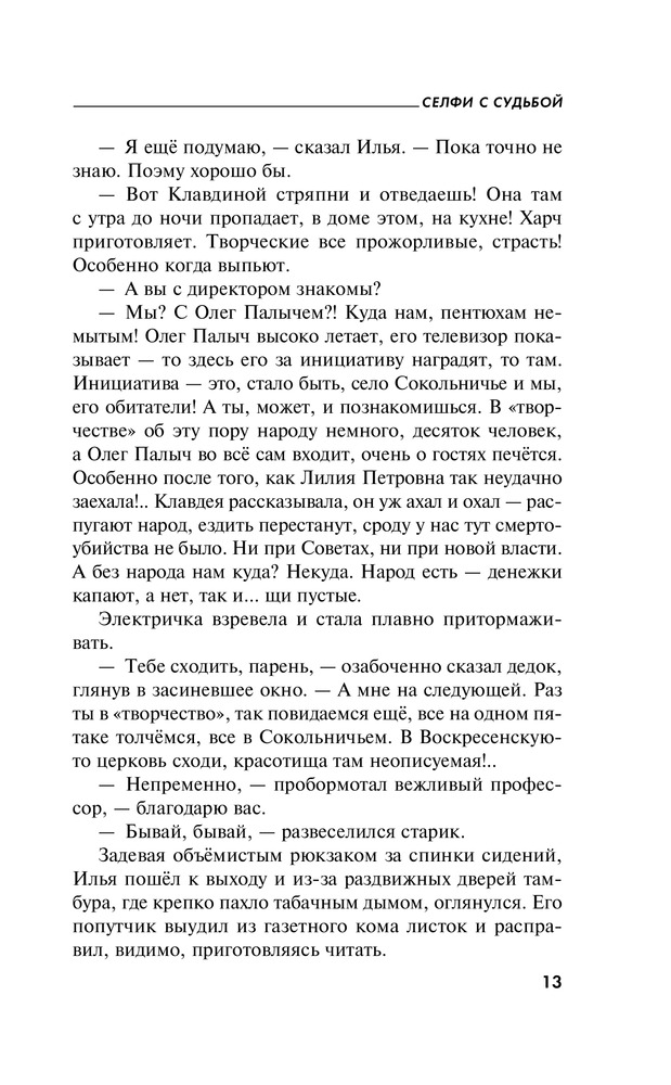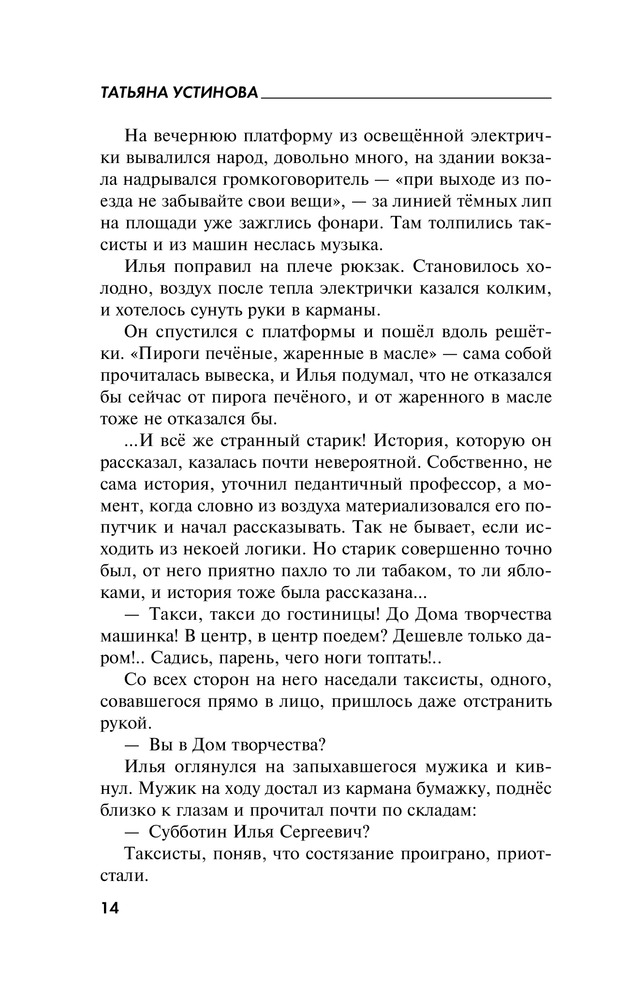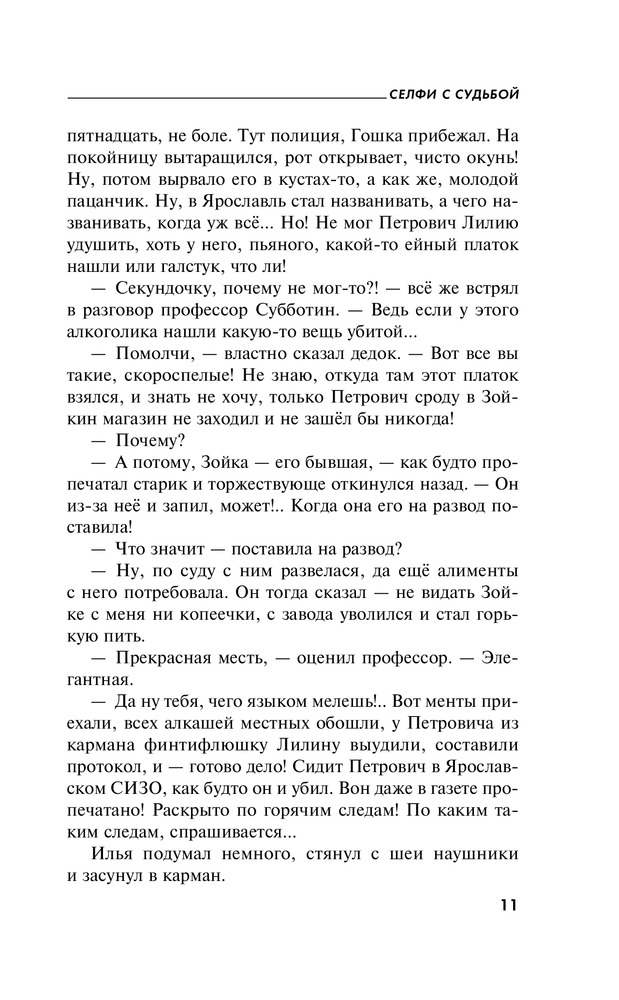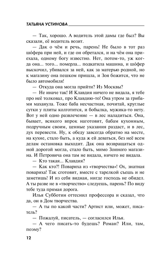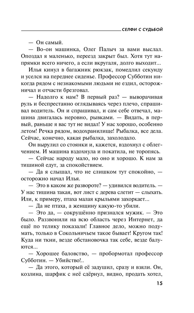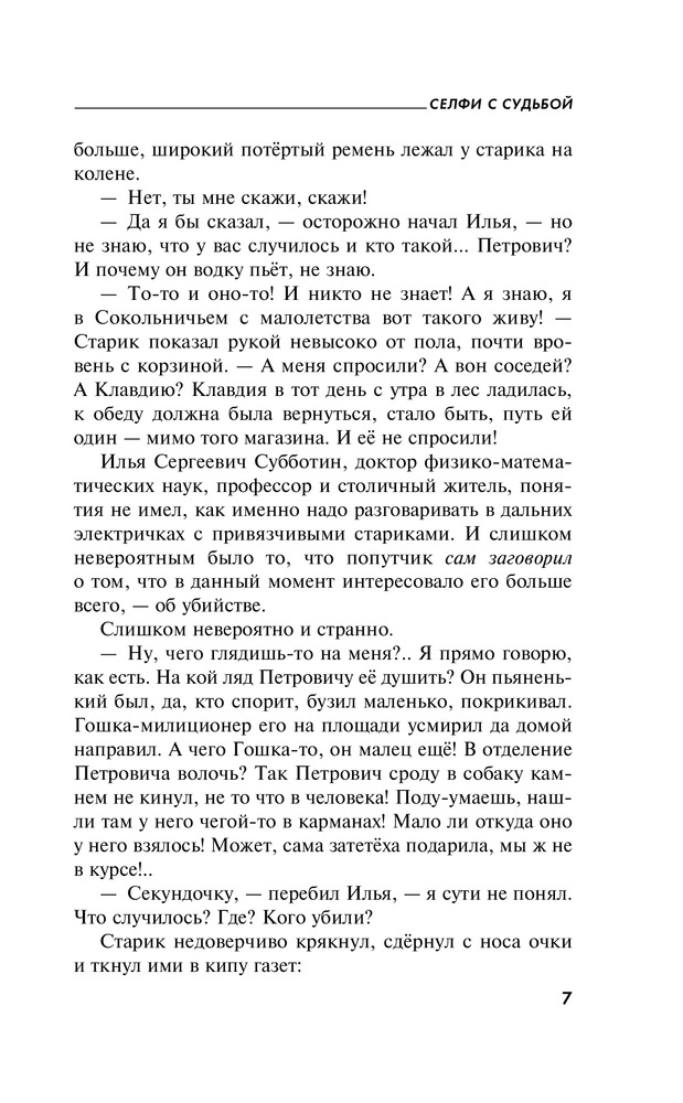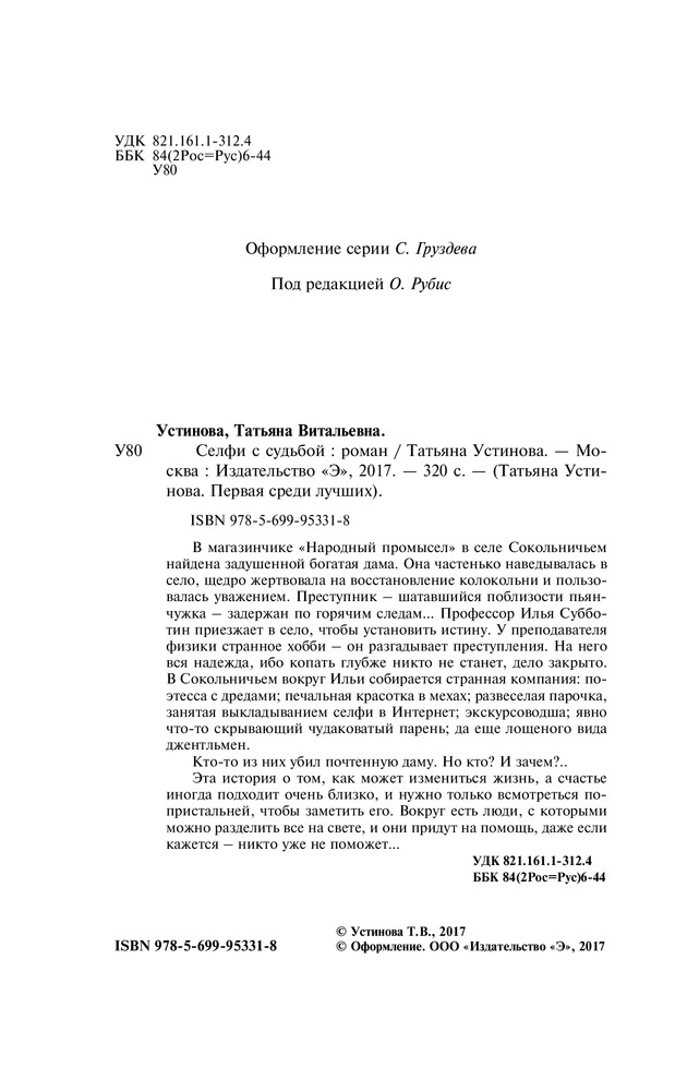 Селфи с судьбойВ данный момент этот товар отсутствует в продаже. Возможно, у нас найдется аналогичный или похожий товар здесь. Серия: Татьяна Устинова. Первая среди лучших В магазинчике «Народный промысел» в селе Сокольничьем найдена задушенной богатая дама. Она частенько наведывалась в село, щедро жертвовала на восстановление колокольни и пользовалась уважением. Преступник — шатавшийся поблизости пьянчужка — задержан по горячим следам... Профессор Илья Субботин приезжает в село, чтобы установить истину. У преподавателя физики странное хобби — он разгадывает преступления. На него вся надежда, ибо копать глубже никто не станет, дело закрыто. В Сокольничьем вокруг Ильи собирается странная компания: поэтесса с дредами; печальная красотка в мехах; развеселая парочка, занятая выкладыванием селфи в Интернет; экскурсоводша; явно что-то скрывающий чудаковатый парень; да еще лощеного вида джентльмен. |