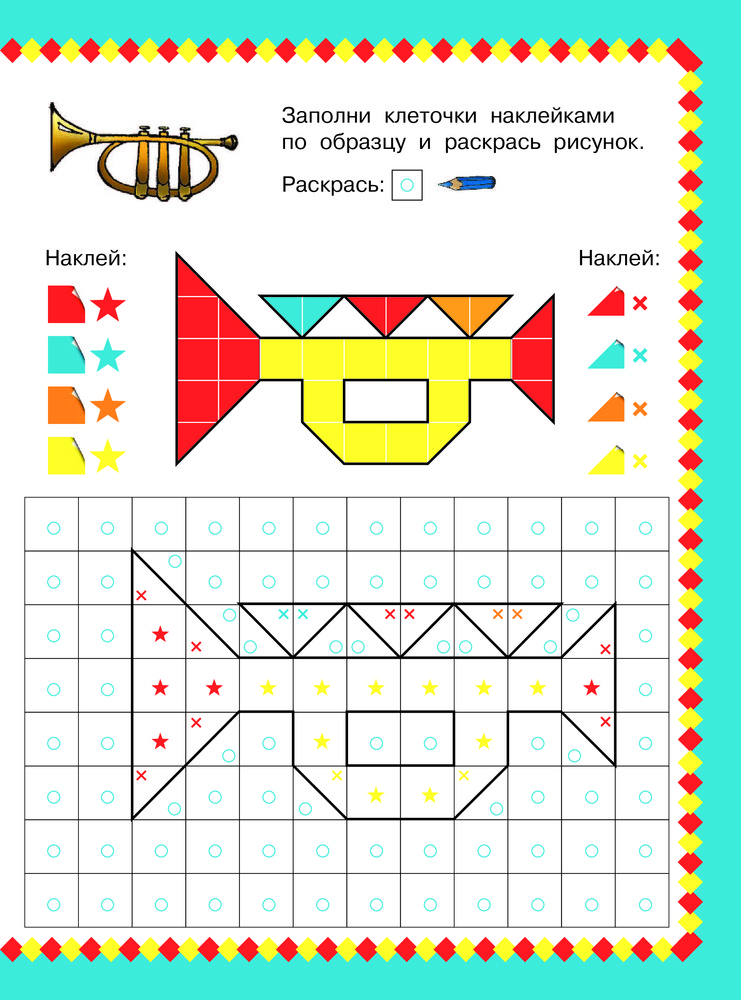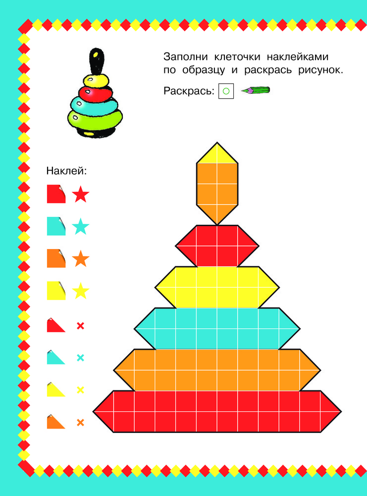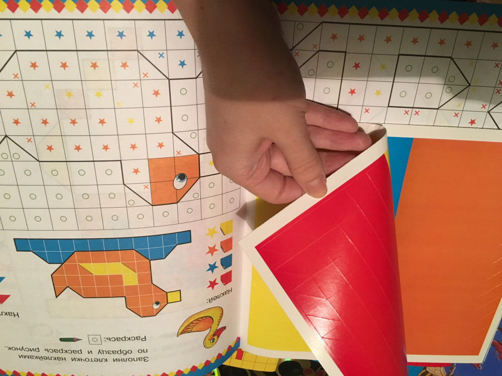 Интересная мозаика! Даны рисунки в виде разноцветной клетки, на которые нужно наклеить квадратики и треугольнички, чтобы получить красочную картинку! Отличное развитие мелкой моторики!