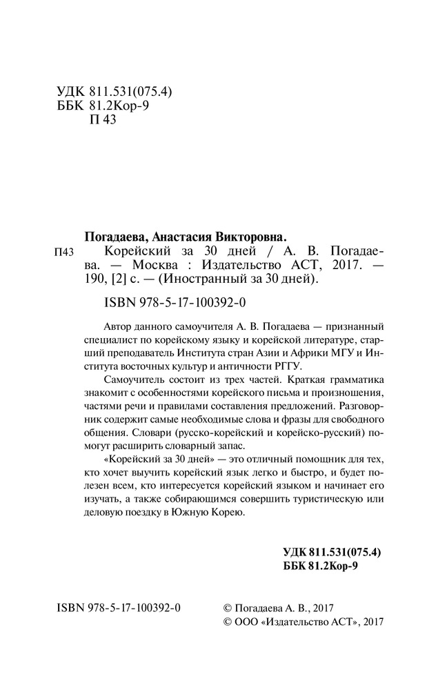 Корейский за 30 днейАнастасия Викторовна Погадаева В данный момент этот товар отсутствует в продаже. Возможно, у нас найдется аналогичный или похожий товар здесь. Серия: Иностранный за 30 дней Автор данного самоучителя А.В. Погадаева — признанный специалист по корейскому языку и корейской литературе, старший преподаватель Института стран Азии и Африки МГУ и Института восточных культур и античности РГГУ. |