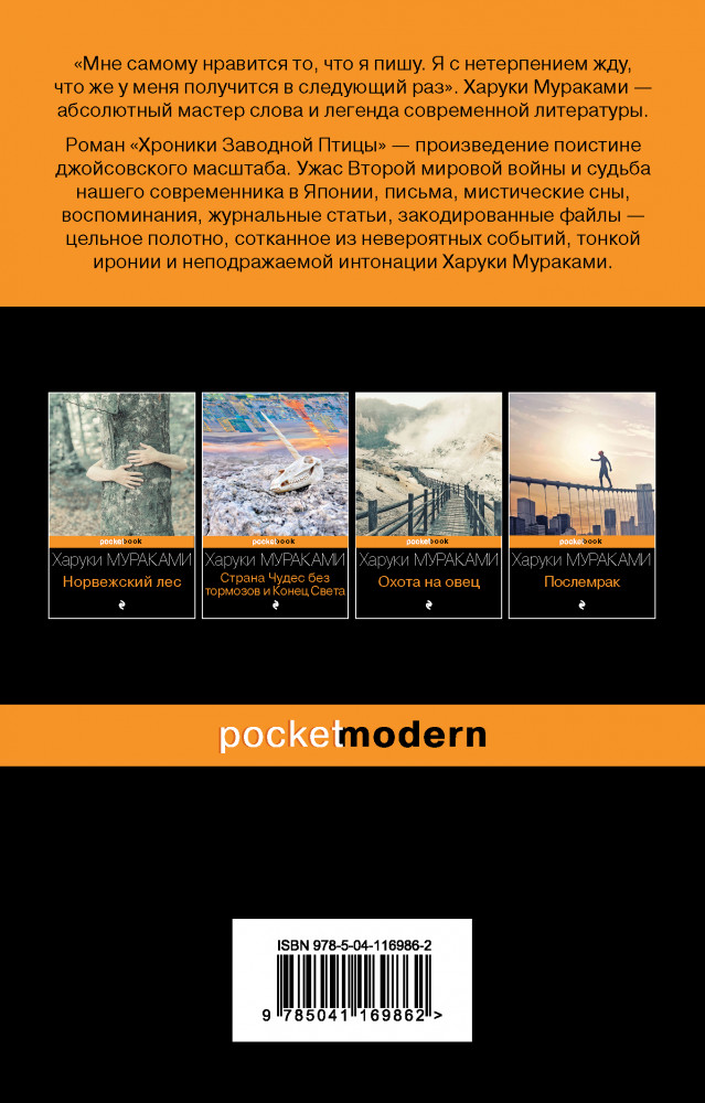Хроники Заводной ПтицыВ данный момент этот товар отсутствует в продаже. Возможно, у нас найдется аналогичный или похожий товар здесь. Серия: Pocket Book (обложка) Роман «Хроники Заводной Птицы» Харуки Мураками — произведение поистине джойсовского масштаба. Ужас Второй мировой войны и судьба нашего современника в Японии, письма, мистические сны, воспоминания, журнальные статьи, закодированные файлы — цельное полотно, сотканное из невероятных событий, тонкой иронии и неподражаемой интонации Харуки Мураками. |
