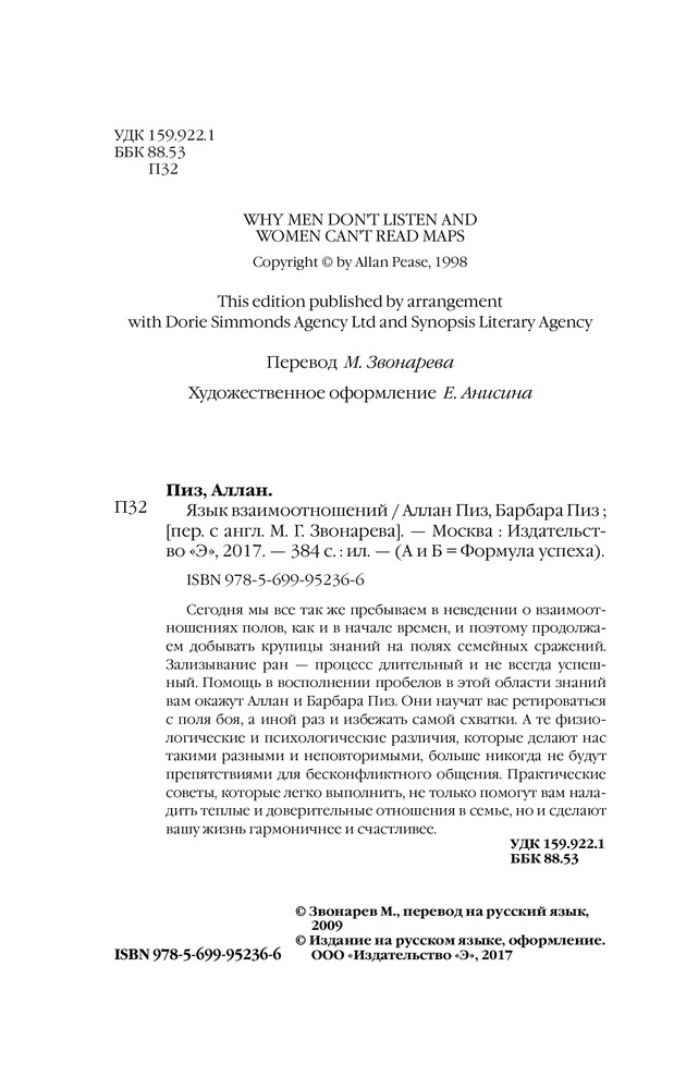 Язык взаимоотношений. Как научиться общаться с противоположным полом без конфликтовВ данный момент этот товар отсутствует в продаже. Возможно, у нас найдется аналогичный или похожий товар здесь. Серия: А и Б = Формула успеха (обложка, новое оформление) Сегодня мы все так же пребываем в неведении о взаимоотношениях полов, как и в начале времен, и поэтому продолжаем добывать крупицы знаний на полях семейных сражений. Зализывание ран — процесс длительный и не всегда успешный. Помощь в восполнении пробелов в этой области знаний Вам окажут Аллан и Барбара Пиз. Они научат Вас ретироваться с поля боя, а иной раз и избежать самой схватки. А те физиологические и психологические различия, которые делают нас такими разными и неповторимыми, больше никогда не будут препятствиями для бесконфликтного общения. Практические советы, которые легко выполнить, помогут Вам не только наладить теплые и доверительные отношения в семье, но и сделают Вашу жизнь гармоничнее и счастливее. |