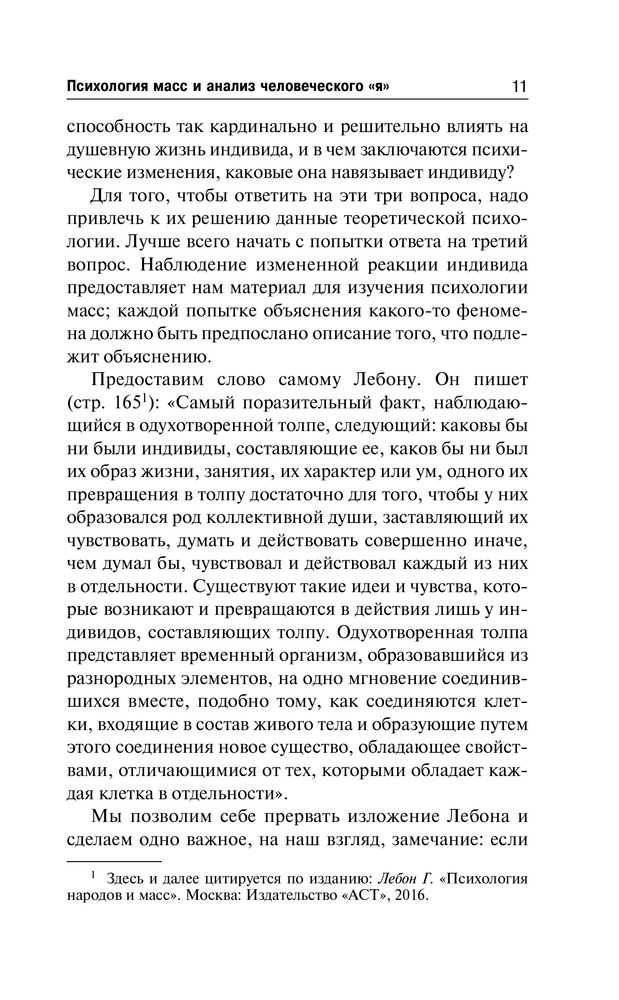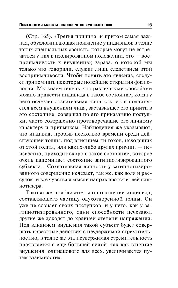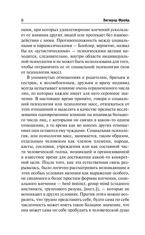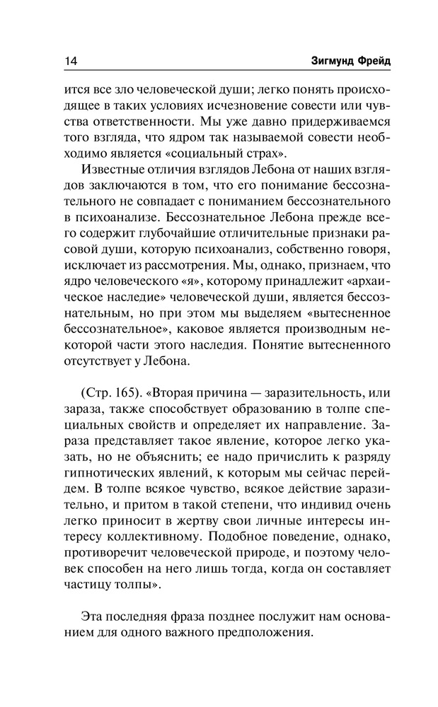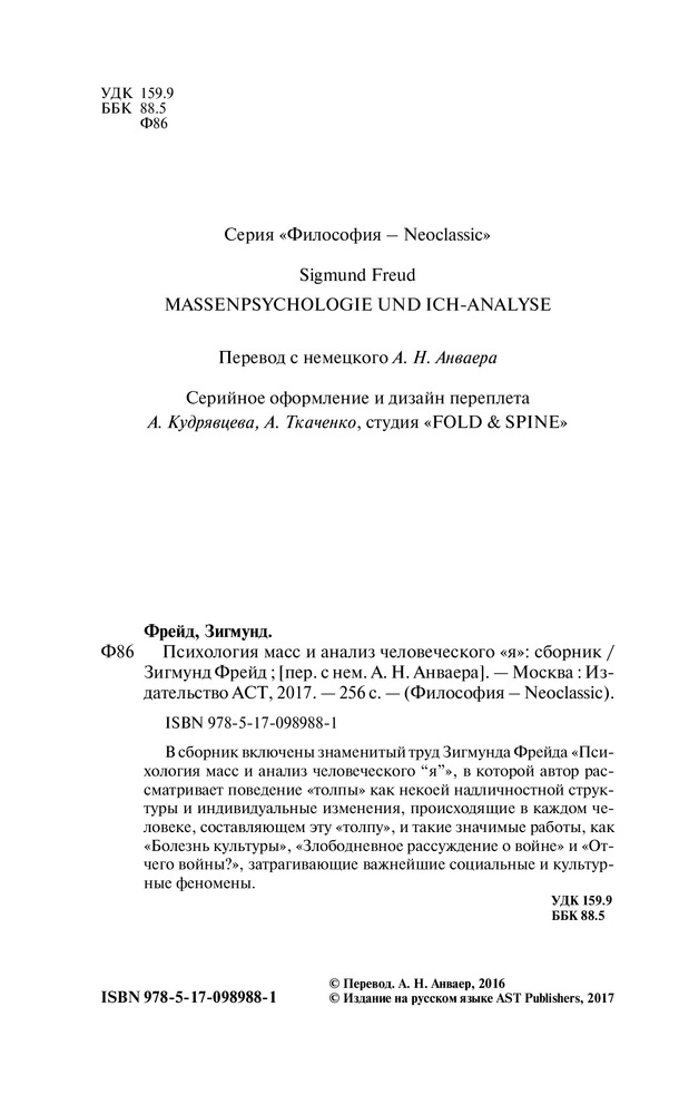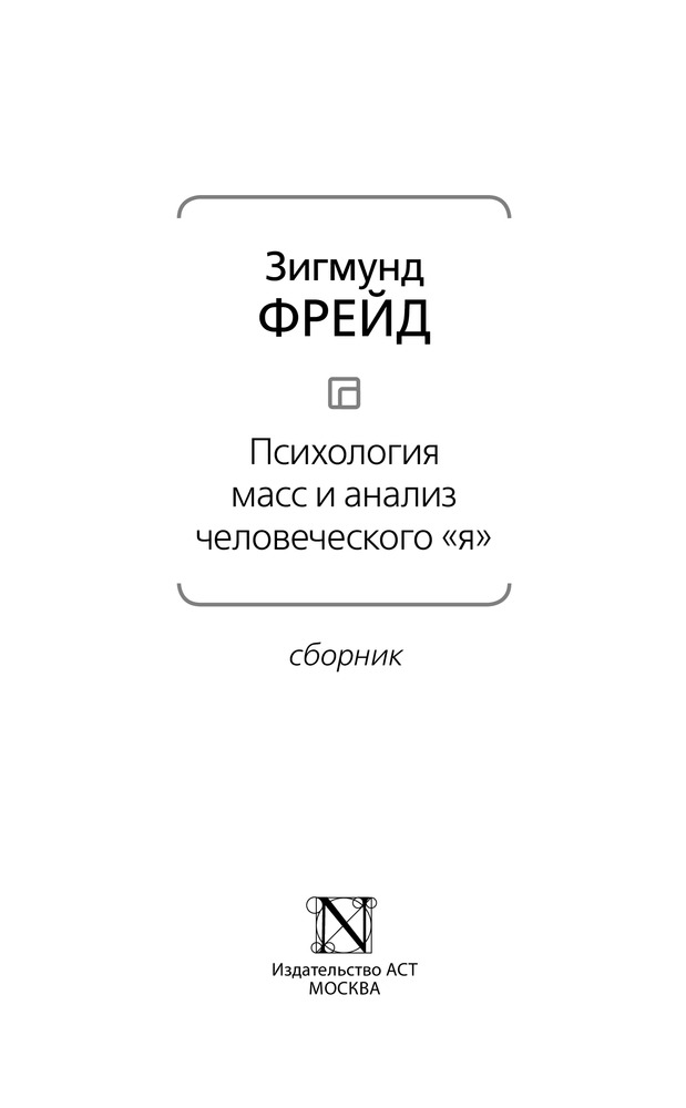 Серия: Философия – Neoclassic В сборник включены знаменитый труд Зигмунда Фрейда «Психология масс и анализ человеческого „Я“», в которой автор рассматривает поведение «толпы» как некоей надличностной структуры и индивидуальные изменения, происходящие в каждом человеке, составляющем эту «толпу», и такие значимые работы, как «Болезнь культуры», «Злободневное рассуждение о войне» и «Отчего войны?», затрагивающие важнейшие социальные и культурные феномены. |