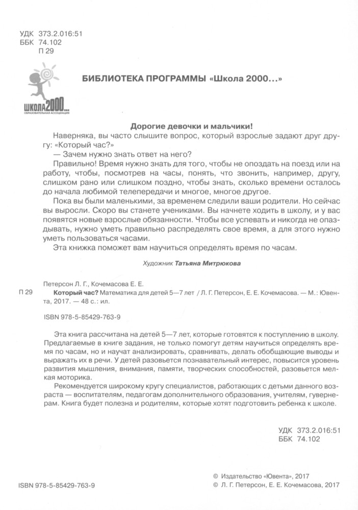 Который час? Математика для детей 5-7 лет. ФГОС ДОВ данный момент этот товар отсутствует в продаже. Возможно, у нас найдется аналогичный или похожий товар здесь. Эта книга рассчитана на детей 5-7 лет, которые готовятся к поступлению в школу. Предлагаемые в книге задания не только помогут детям научиться определять время по часам, но и научат анализировать, сравнивать, делать обобщающие выводы и выражать их в речи. У детей разовьется познавательный интерес, повысится уровень развития мышления, внимания, памяти, творческих способностей, разовьется мелкая моторика. Рекомендуется широкому кругу специалистов, работающих с детьми данного возраста — воспитателям, педагогам дополнительного образования, учителям, гувернерам. |