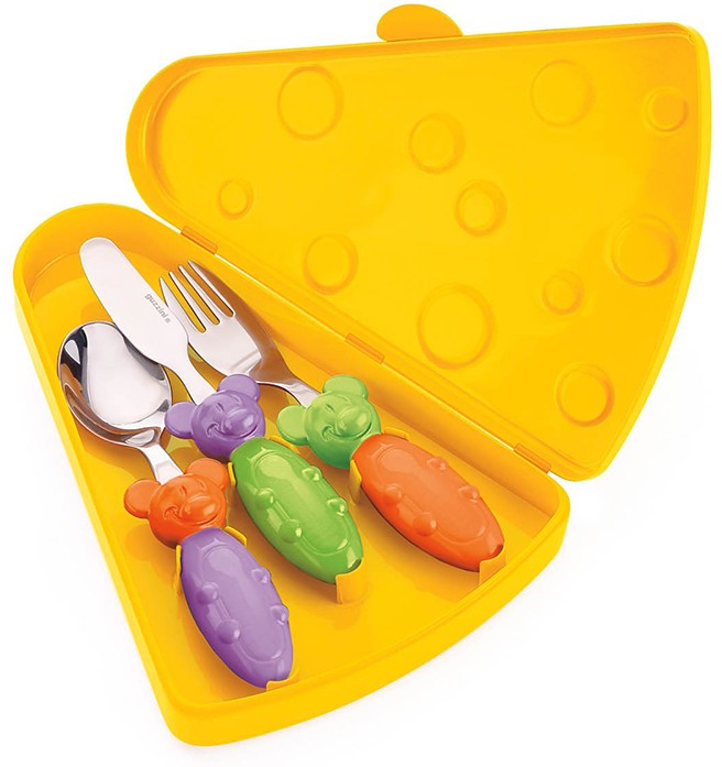 Набор столовых приборов «Tip Top Tap» состоит из небольших ложки, ножа, вилки и специального футляра в форме кусочка знаменитого швейцарского сыра «с дырочками». Все три предмета компактно крепятся в футляр, что экономит место в шкафу и очень удобно при транспортировке.