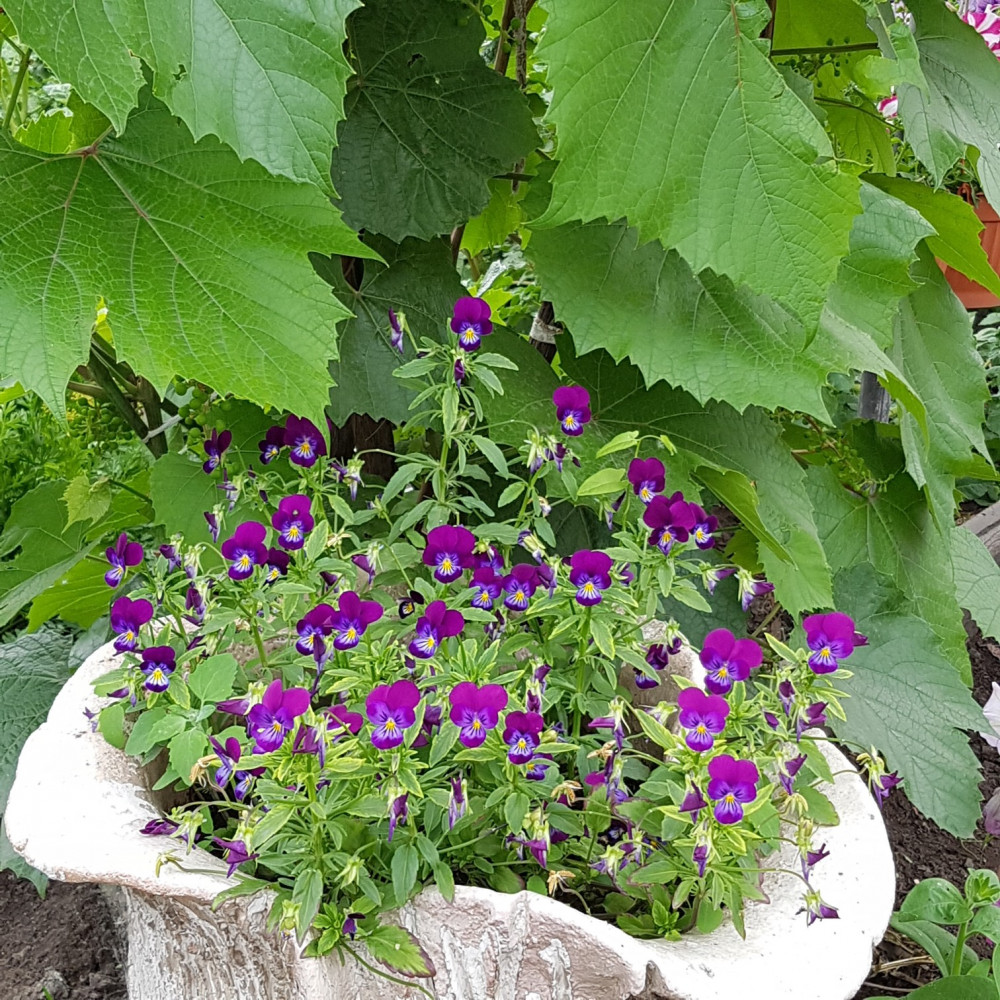 Так она выглядит в конце июня. 3 кустика в горшке на 4,5 л. Не выносит прямых солнечных лучей. Хорошо растет под деревьями, на крыльце, под шпалерой с виноградом.