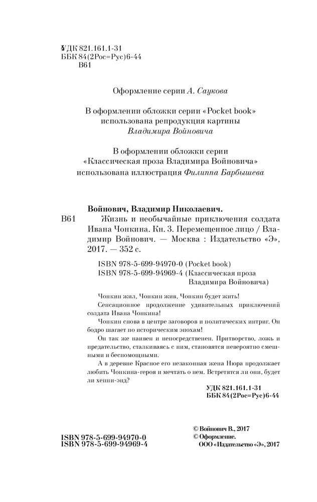 Жизнь и необычайные приключения солдата Ивана Чонкина. Книга 3. Перемещенное лицоВ данный момент этот товар отсутствует в продаже. Возможно, у нас найдется аналогичный или похожий товар здесь. Серия: Pocket Book (обложка) Чонкин жил, Чонкин жив, Чонкин будет жить! |