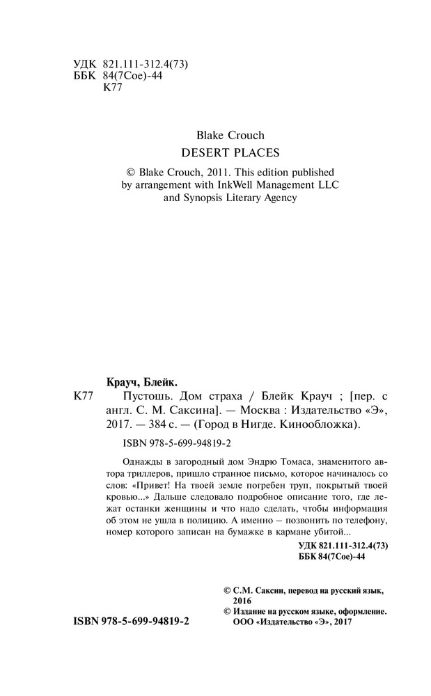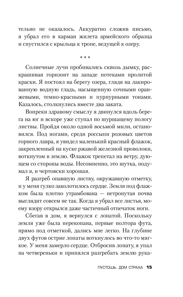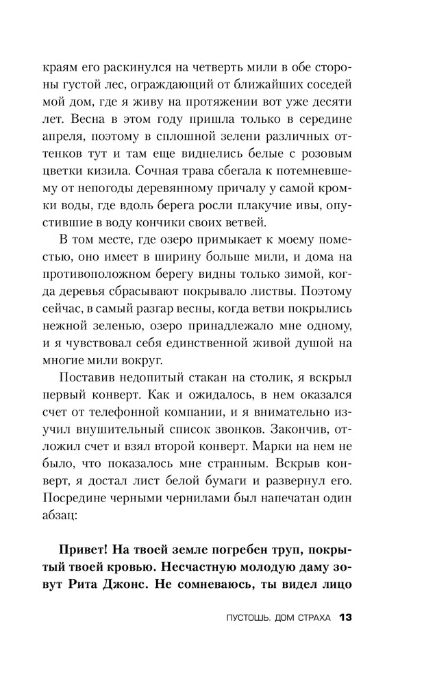 Пустошь. Дом страхаВ данный момент этот товар отсутствует в продаже. Возможно, у нас найдется аналогичный или похожий товар здесь. Серия: Город в Нигде. Кинообложка Однажды в загородный дом Эндрю Томаса, знаменитого автора триллеров, пришло странное письмо, которое начиналось со слов: «Привет! На твоей земле погребен труп, покрытый твоей кровью...» Дальше следовало подробное описание того, где лежат останки женщины и что надо сделать, чтобы информация об этом не ушла в полицию. А именно — позвонить по телефону, номер которого записан на бумажке в кармане убитой... |